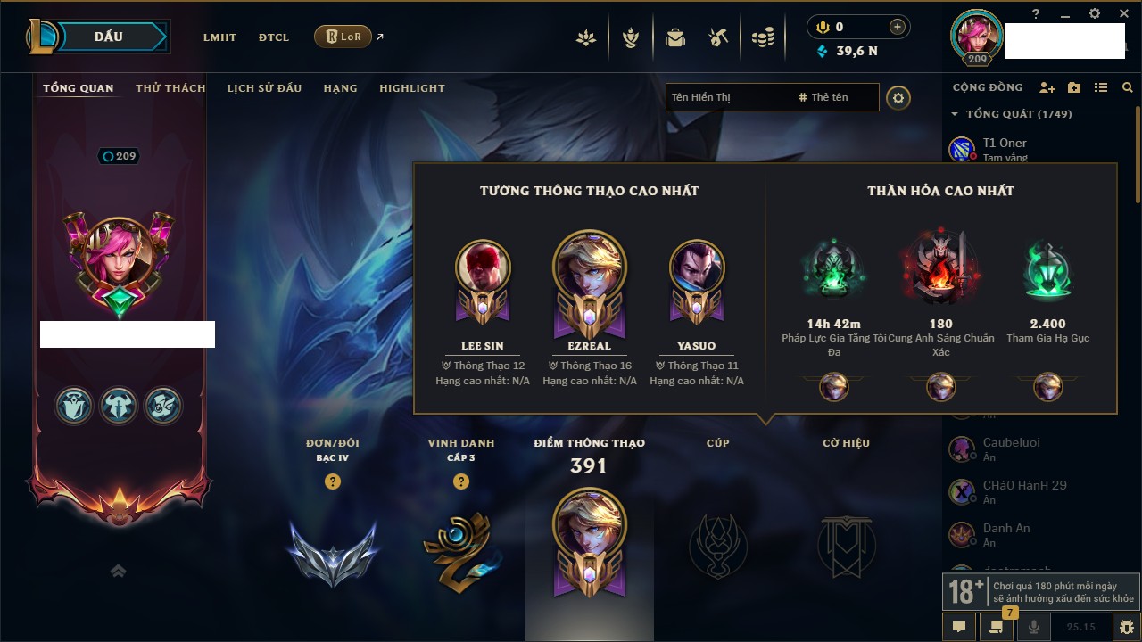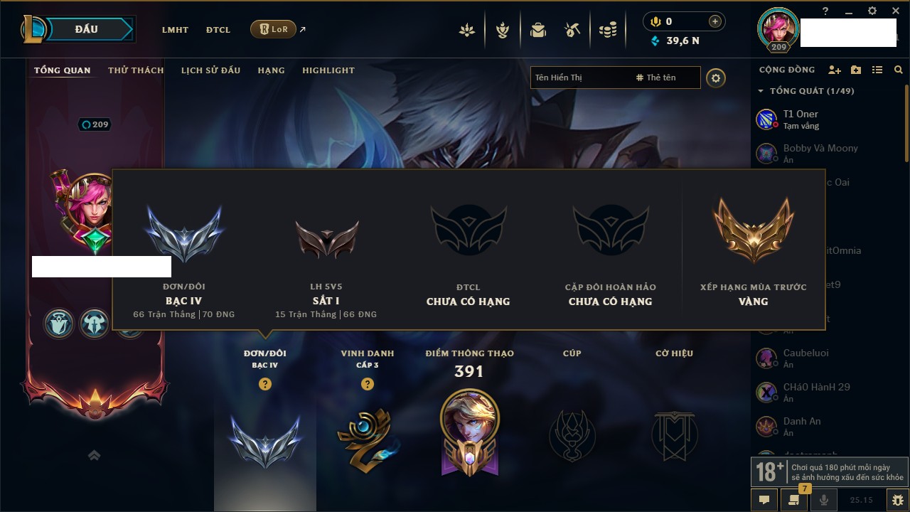 Rank Đơn: Chưa rank mùa nào Khung: Chưa có khung Tướng: 3 - Còn 9500 THX Trang Phục: 0 Rank ĐTCL: Bạch Kim IV Linh Thú: 21
