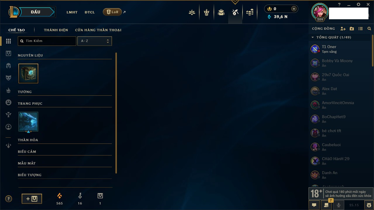 Rank Đơn: Chưa rank mùa nào Khung: Chưa có khung Tướng: 0 - Còn 17050 THX Trang Phục: 1 Rank ĐTCL: Chưa Rank Linh Thú: 87