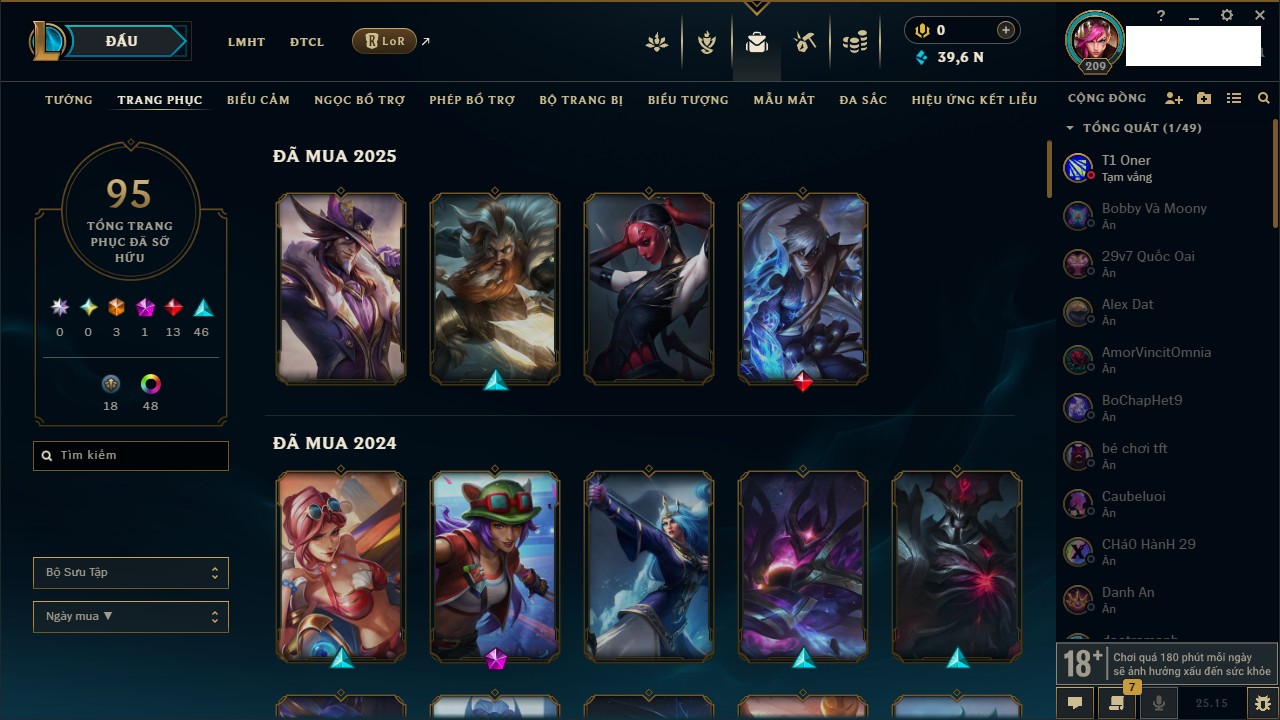 Rank Đơn: Chưa rank mùa nào Khung: Chưa có khung Tướng: 35 - Còn 21851 THX Trang Phục: 3 Rank ĐTCL: Bạch Kim IV Linh Thú: 144
