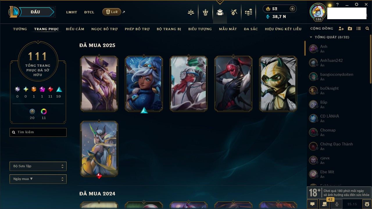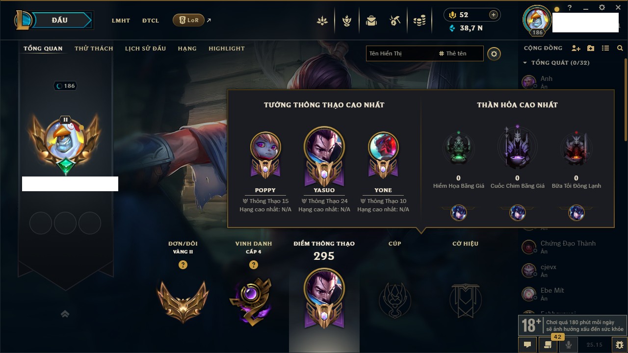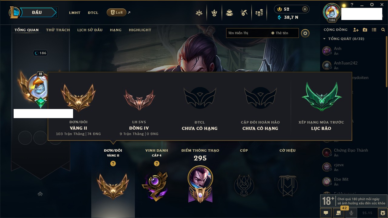 Rank Đơn: Vàng IIIKhung: VàngTướng: 161 - Còn 162202 THXTrang Phục: 179Rank ĐTCL: Chưa RankLinh Thú: 20