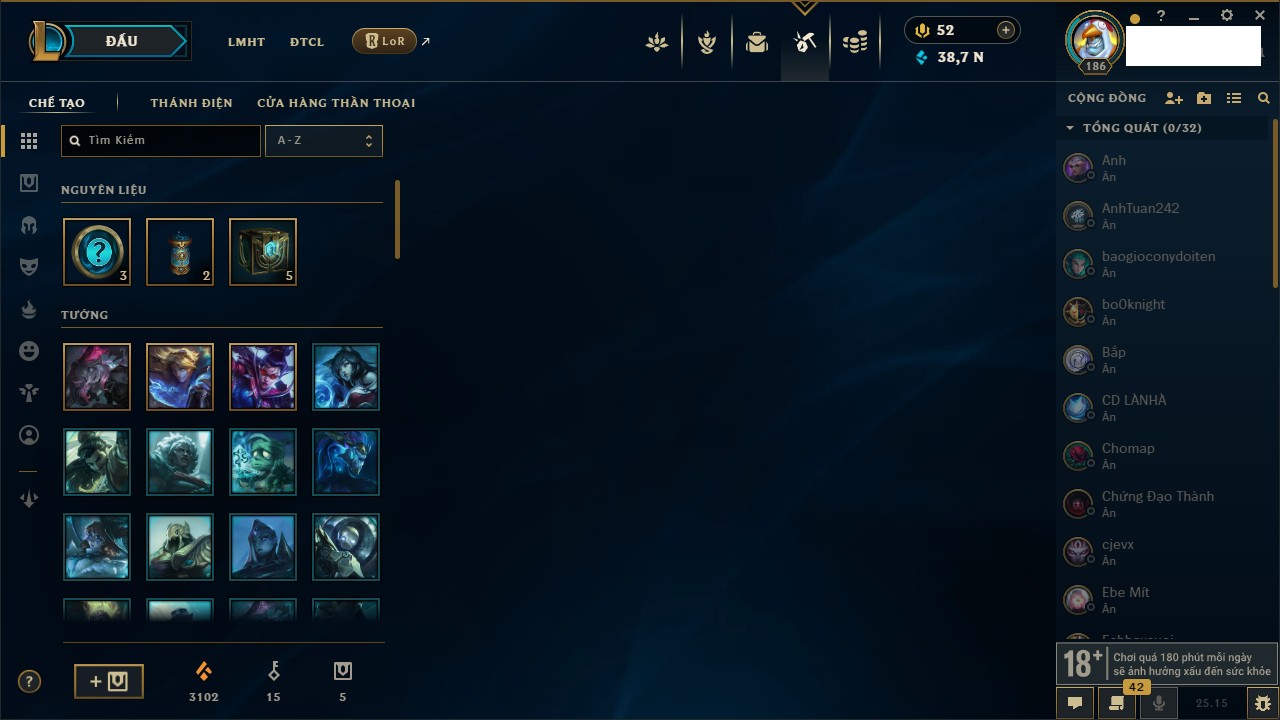Rank Đơn: Bạc IIIKhung: Chưa có khungTướng: 171 - Còn 21493 THXTrang Phục: 252Rank ĐTCL: Bạch Kim IVLinh Thú: 123