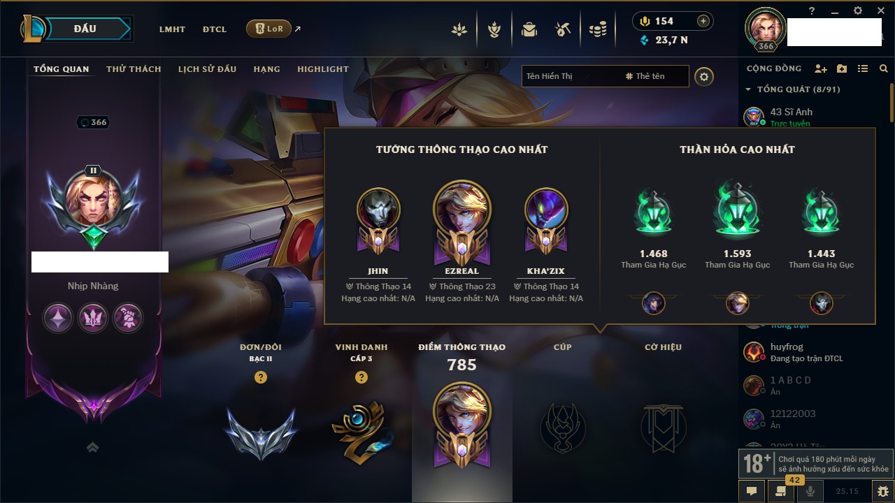 Rank Đơn: Chưa rank mùa nào Khung: Chưa có khung Tướng: 48 - Còn 9500 THX Trang Phục: 12 Rank ĐTCL: Kim Cương II Linh Thú: 128