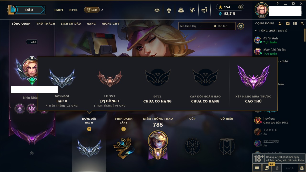 Rank Đơn: Bạc II Khung: Bạc Tướng: 170 - Còn 117834 THX Trang Phục: 192 Rank ĐTCL: Chưa Rank Linh Thú: 234