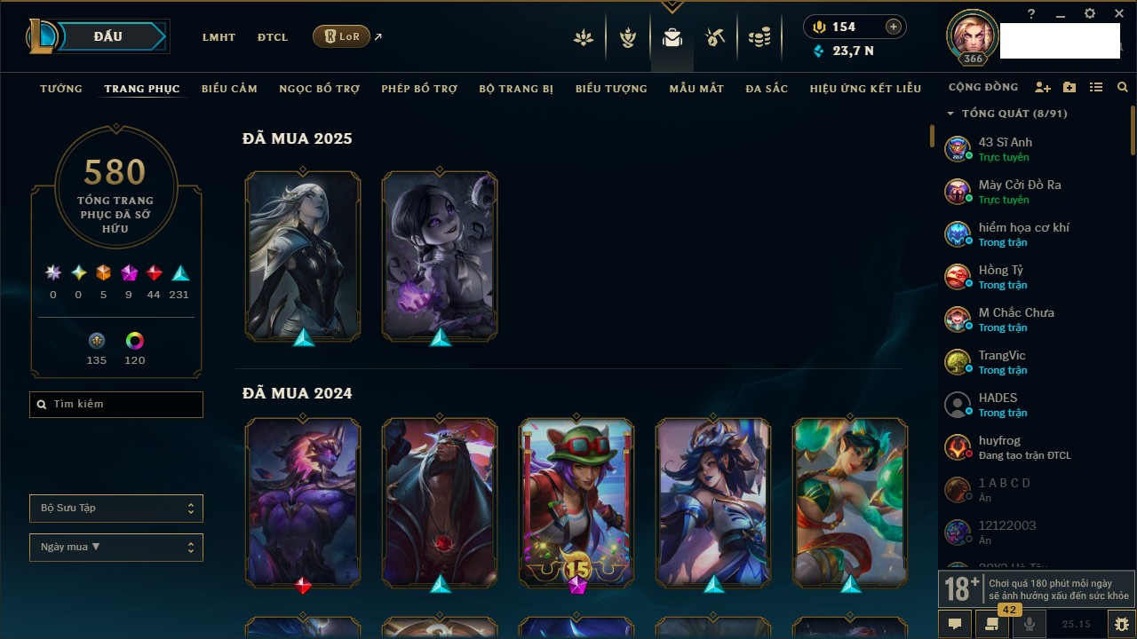 Rank Đơn: Chưa Rank Khung: Chưa có khung Tướng: 104 - Còn 10052 THX Trang Phục: 52 Rank ĐTCL: Chưa Rank Linh Thú: 155