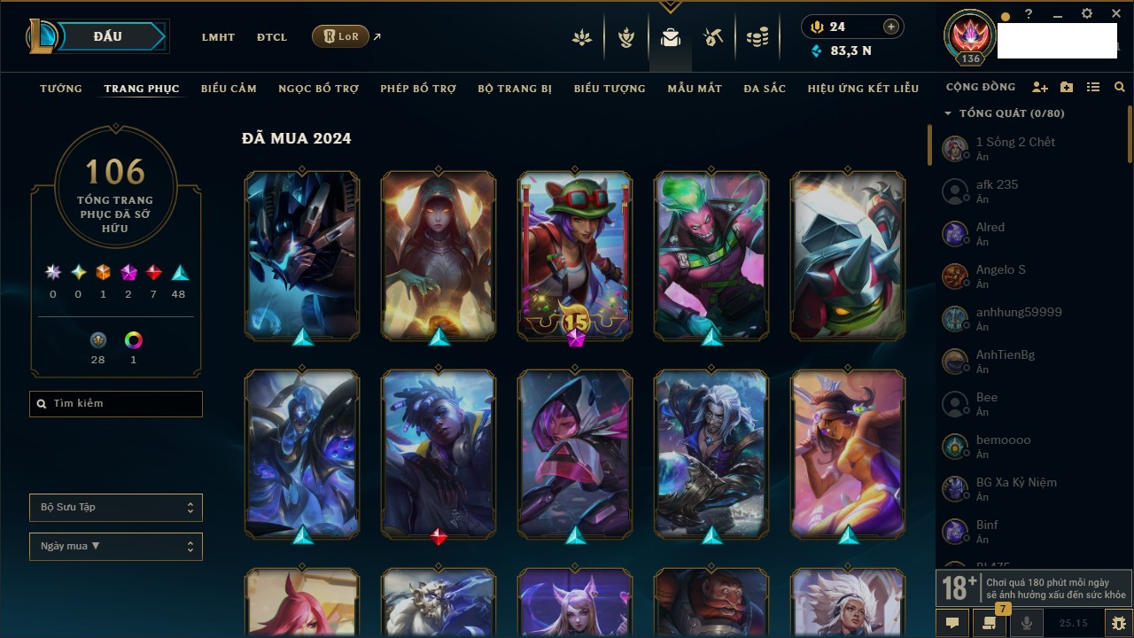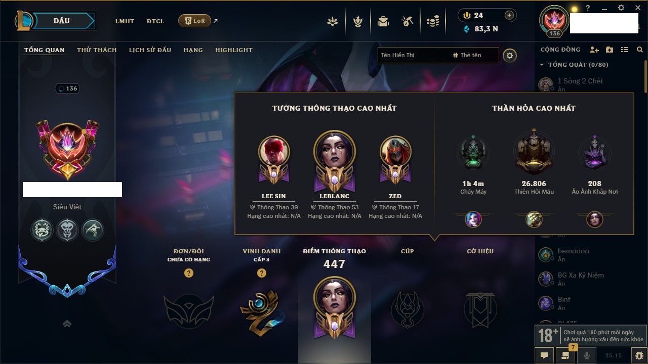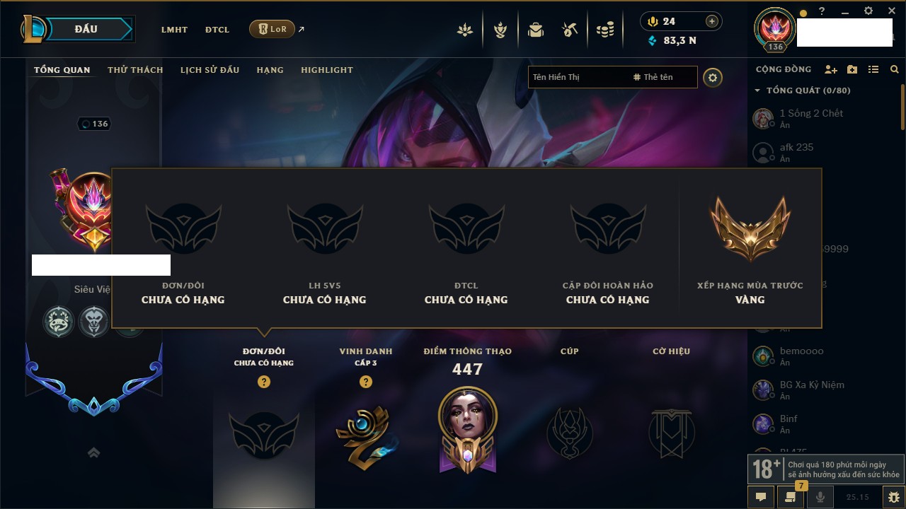 Rank Đơn: Bạc IIKhung: Chưa có khungTướng: 145 - Còn 12230 THXTrang Phục: 183Rank ĐTCL: Chưa RankLinh Thú: 71