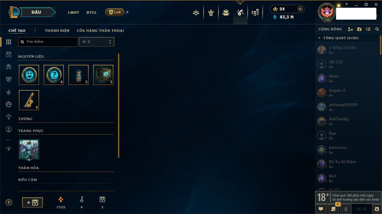 Rank Đơn: Chưa RankKhung: Chưa có khungTướng: 169 - Còn 43188 THXTrang Phục: 205Rank ĐTCL: Chưa RankLinh Thú: 259