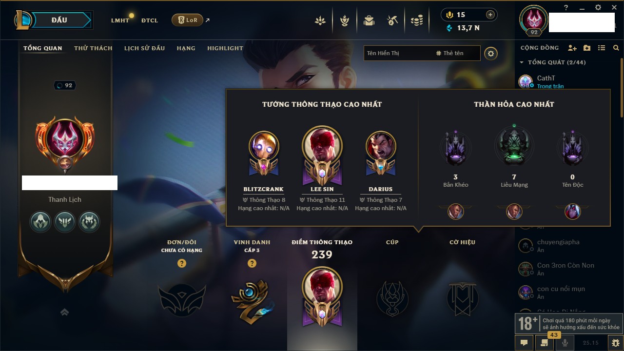 Rank Đơn: Bạch Kim IIIKhung: Bạch kimTướng: 171 - Còn 251383 THXTrang Phục: 229Rank ĐTCL: Sắt IILinh Thú: 51