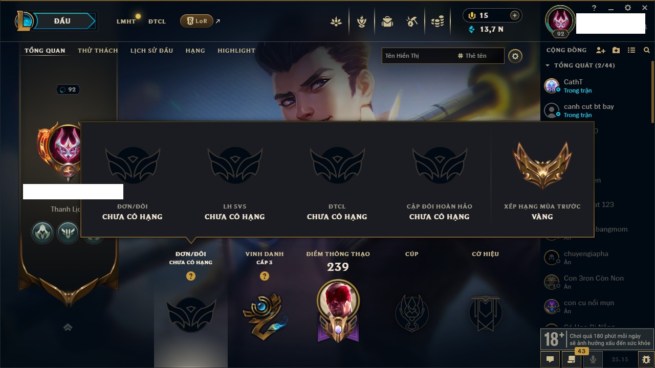 Rank Đơn: Vàng IKhung: BạcTướng: 171 - Còn 60584 THXTrang Phục: 286Rank ĐTCL: Vàng IIILinh Thú: 117