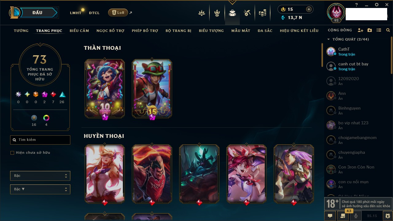 Rank Đơn: Vàng IIIKhung: VàngTướng: 171 - Còn 88128 THXTrang Phục: 329Rank ĐTCL: Chưa RankLinh Thú: 41