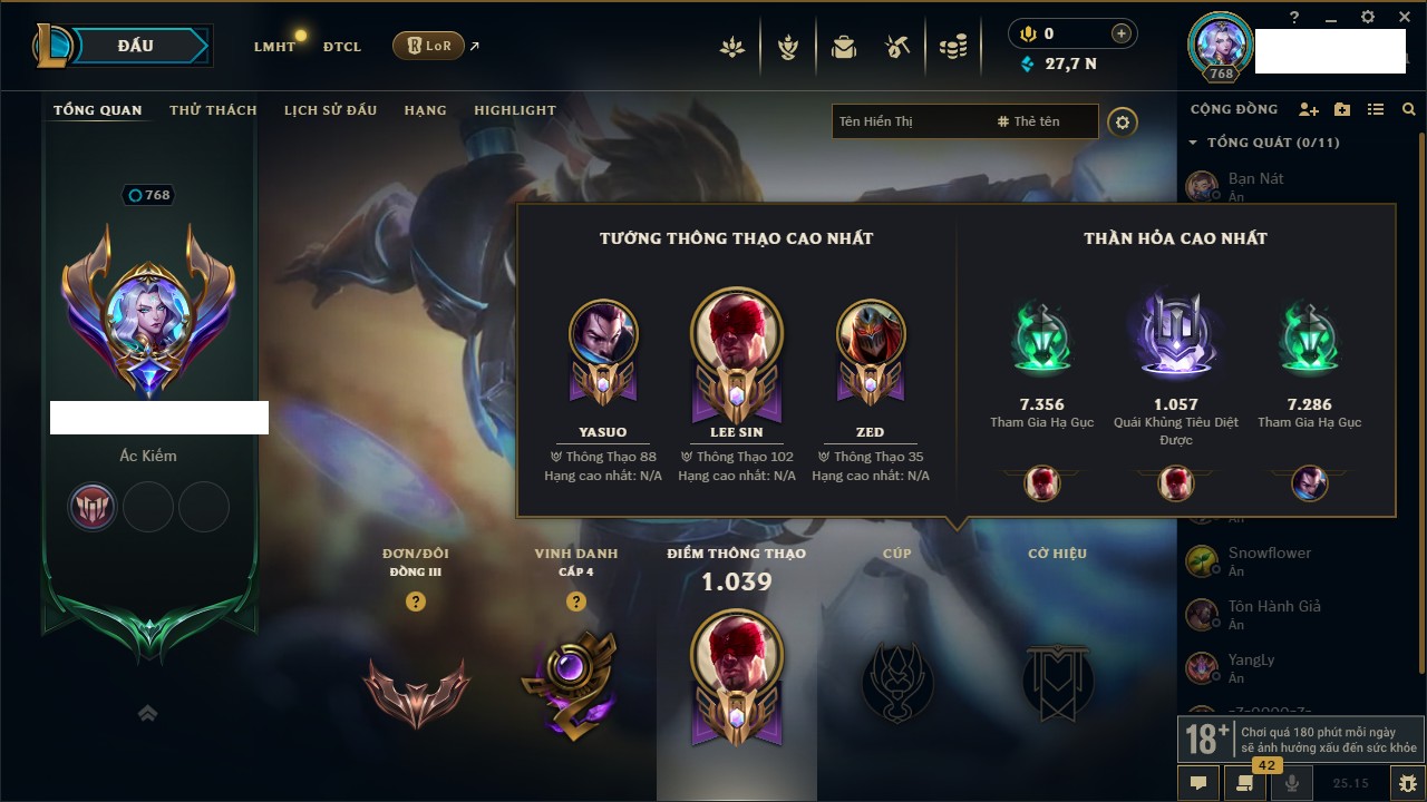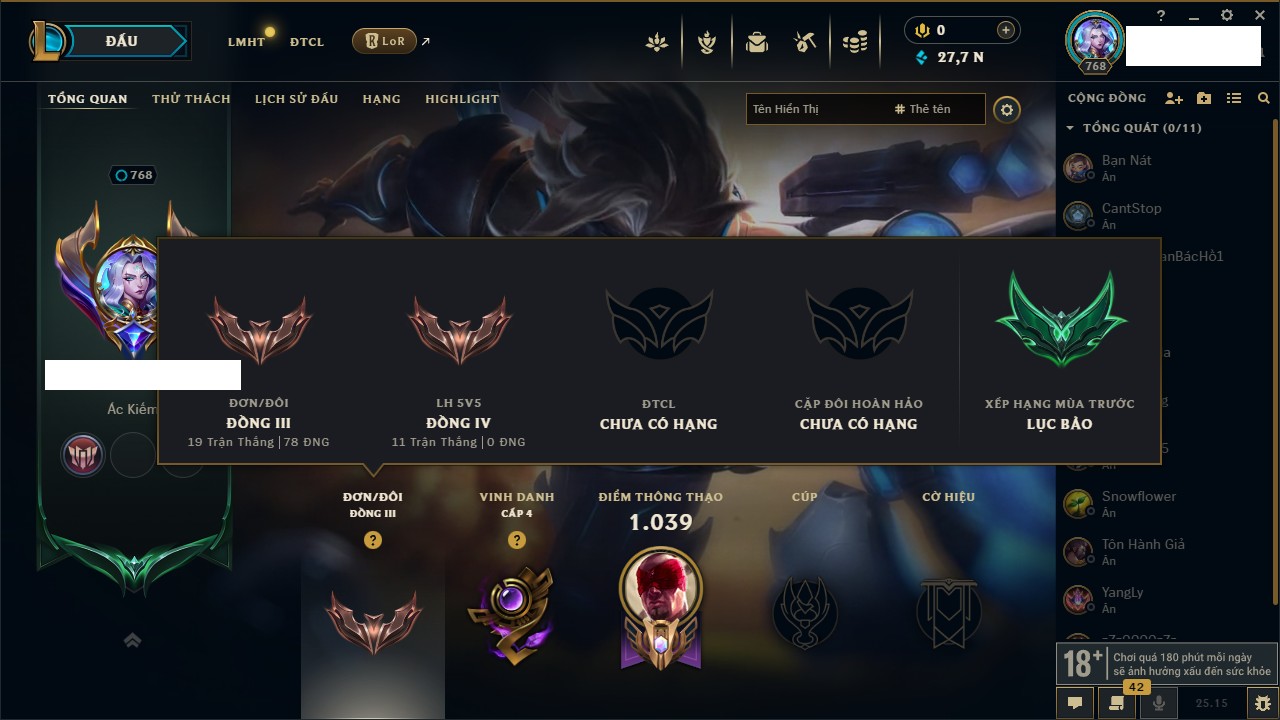 Rank Đơn: Chưa rank mùa nào Khung: Chưa có khung Tướng: 3 - Còn 9500 THX Trang Phục: 0 Rank ĐTCL: Bạch Kim IV Linh Thú: 21
