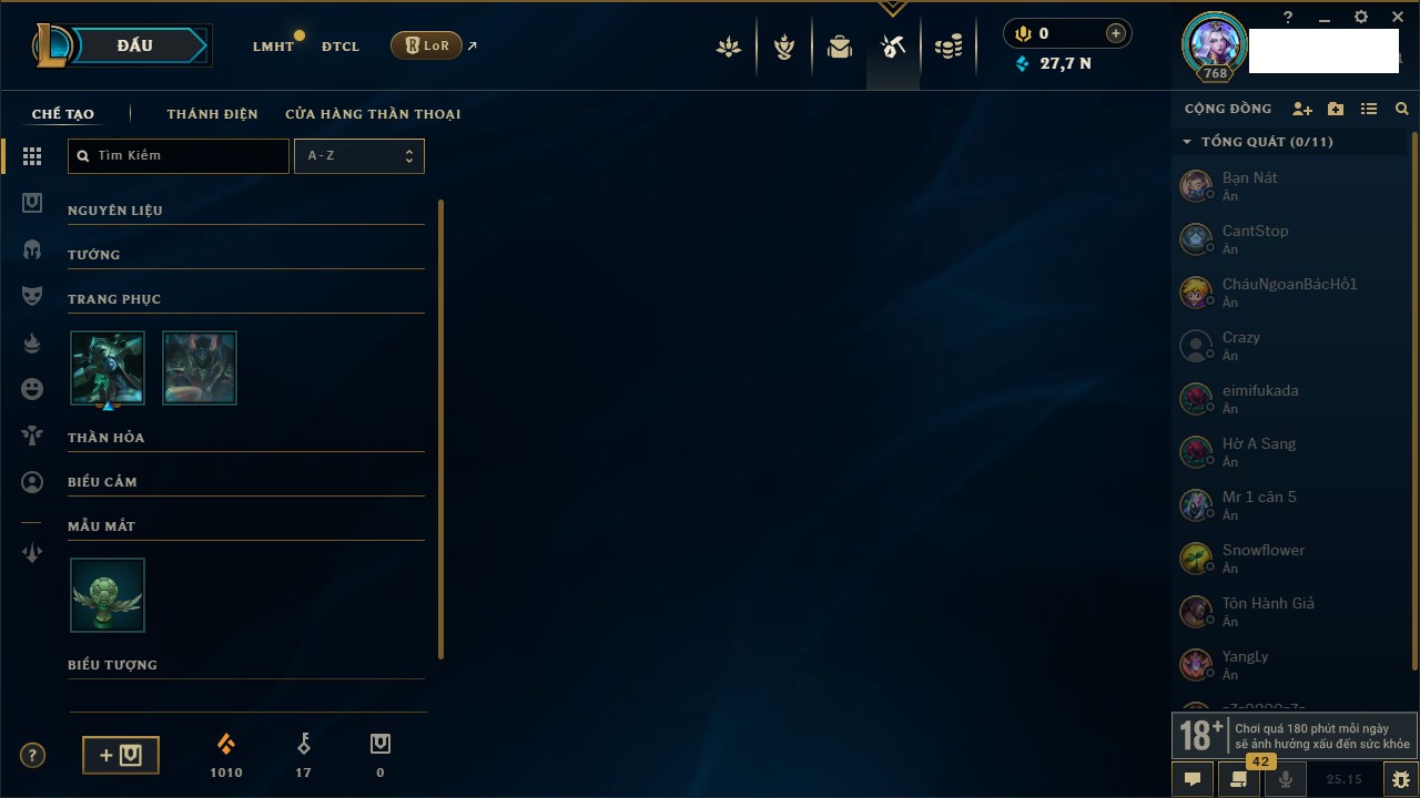 Rank Đơn: Chưa rank mùa nào Khung: Chưa có khung Tướng: 0 - Còn 17050 THX Trang Phục: 1 Rank ĐTCL: Chưa Rank Linh Thú: 87