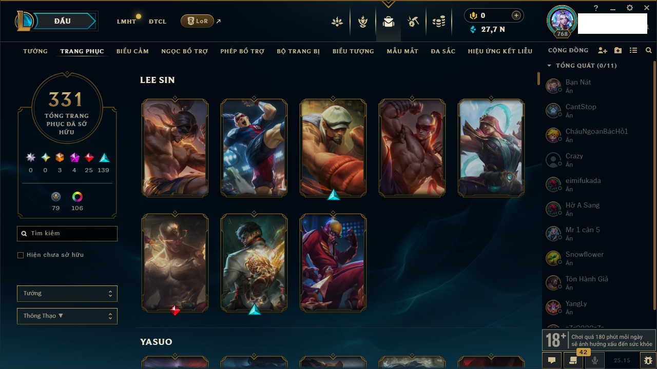 - Cấp 727 - 591,997 IP - Heimerdinger 5,408,339 Thông Thạo - 600 kỷ vật - 2 huy chương - 3250 pha lê - Có pét - Yasuo Long Kiếm Tí Nị