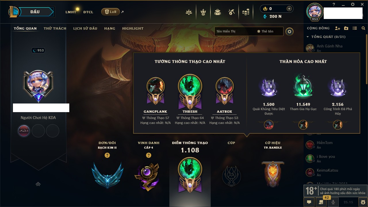 Rank Đơn: Chưa rank mùa nào Khung: Chưa có khung Tướng: 3 - Còn 3800 THX Trang Phục: 0 Rank ĐTCL: Chưa Rank Linh Thú: 31
