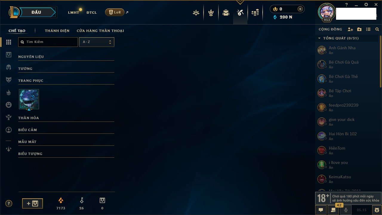Rank Đơn: Chưa rank mùa nào Khung: Chưa có khung Tướng: 56 - Còn 2186 THX Trang Phục: 1 Rank ĐTCL: Chưa Rank Linh Thú: 25