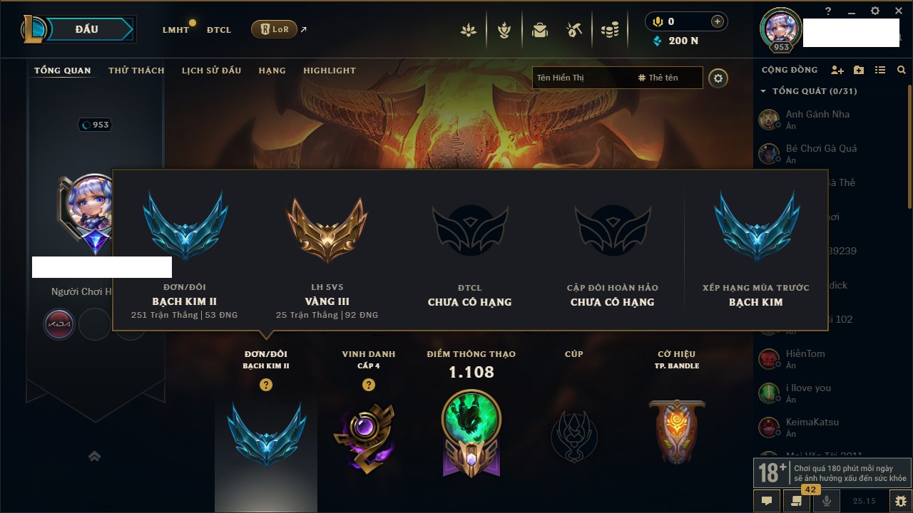 Rank Đơn: Bạc III Khung: Bạc Tướng: 170 - Còn 30078 THX Trang Phục: 225 Rank ĐTCL: Chưa Rank Linh Thú: 138