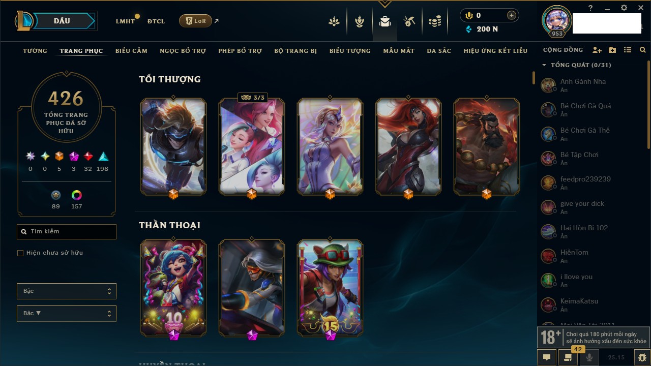 Rank Đơn: Vàng III Khung: Vàng Tướng: 171 - Còn 91047 THX Trang Phục: 98 Rank ĐTCL: Bạch Kim IV Linh Thú: 281