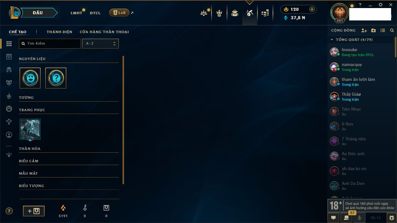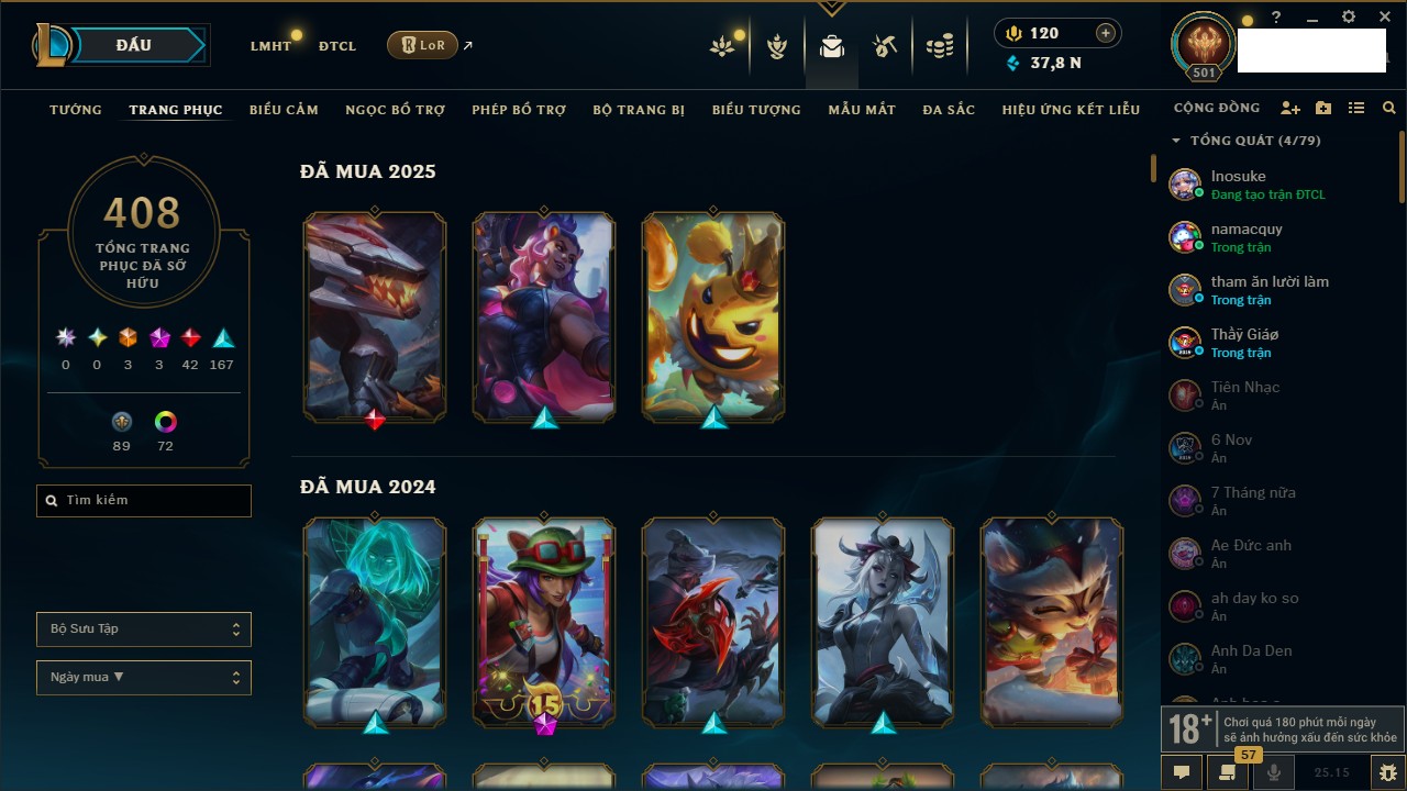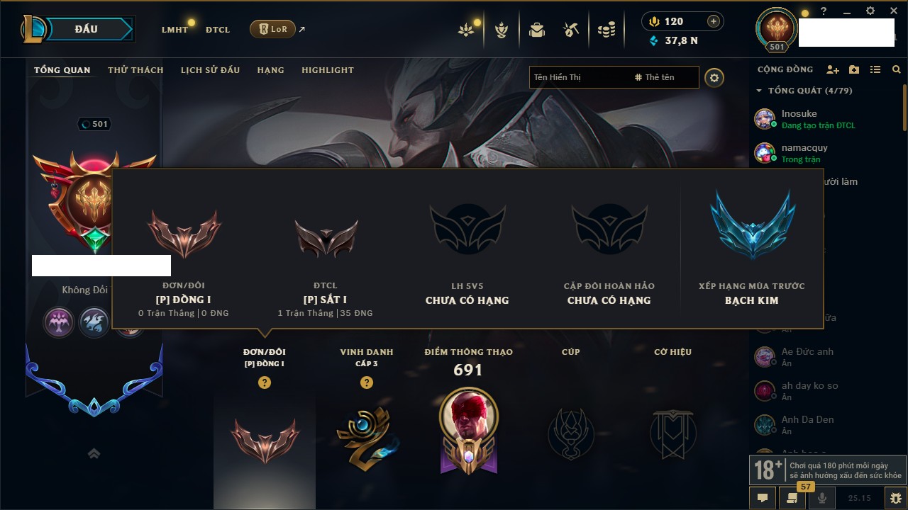 Rank Đơn: Bạc IIKhung: Bạch kimTướng: 169 - Còn 81813 THXTrang Phục: 301Rank ĐTCL: Chưa RankLinh Thú: 140