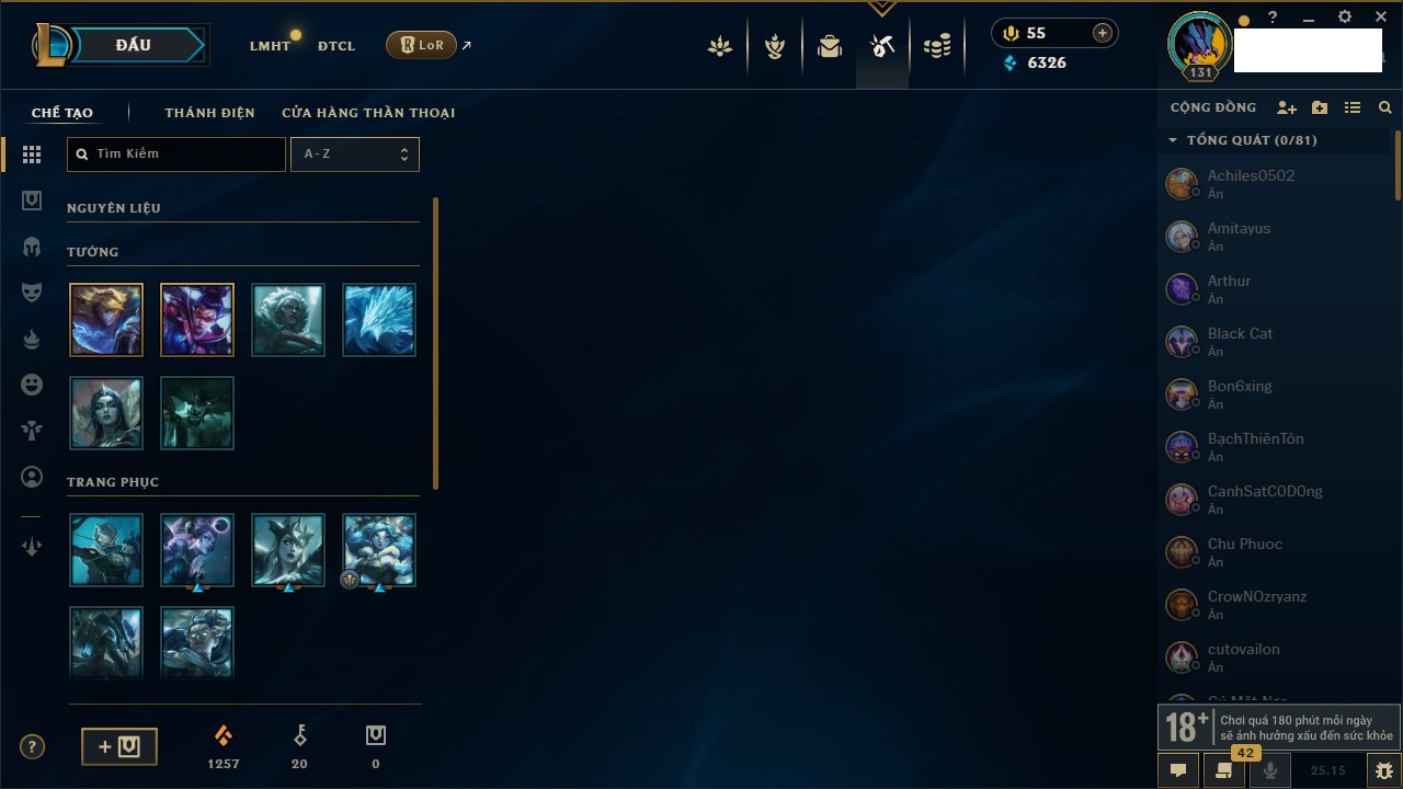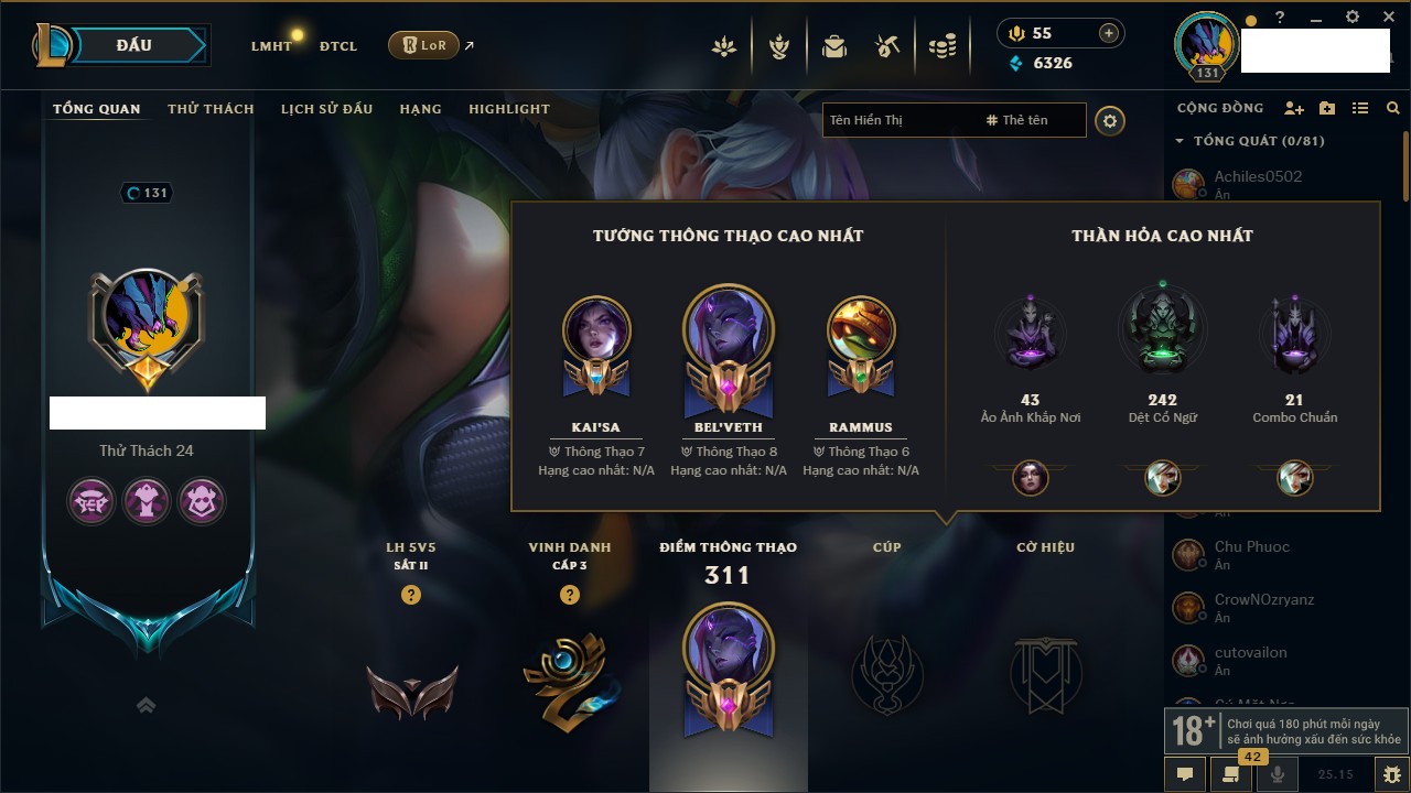 Rank Đơn: Vàng IIIKhung: BạcTướng: 171 - Còn 101359 THXTrang Phục: 88Rank ĐTCL: Kim Cương IVLinh Thú: 200