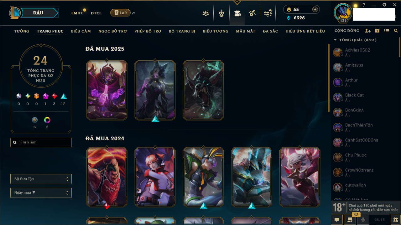 Rank Đơn: Bạc IIIKhung: Chưa có khungTướng: 163 - Còn 66843 THXTrang Phục: 182Rank ĐTCL: Kim Cương IVLinh Thú: 114