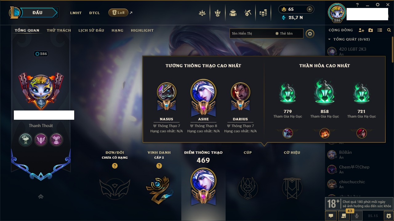 Rank Đơn: Bạch Kim IIIKhung: Bạch kimTướng: 170 - Còn 61079 THXTrang Phục: 352Rank ĐTCL: Sắt IILinh Thú: 70