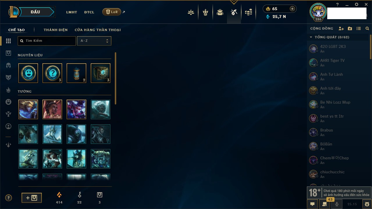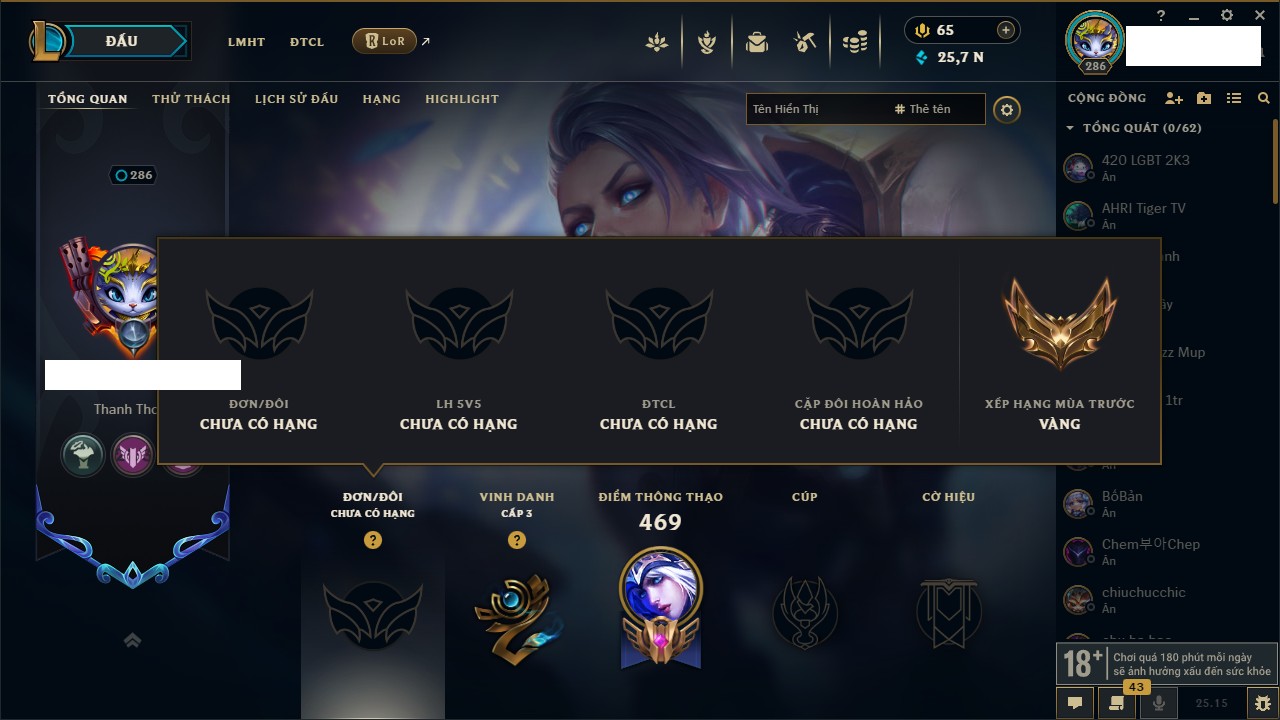 Rank Đơn: Vàng IKhung: Bạch kimTướng: 170 - Còn 212450 THXTrang Phục: 214Rank ĐTCL: Bạch Kim IVLinh Thú: 221
