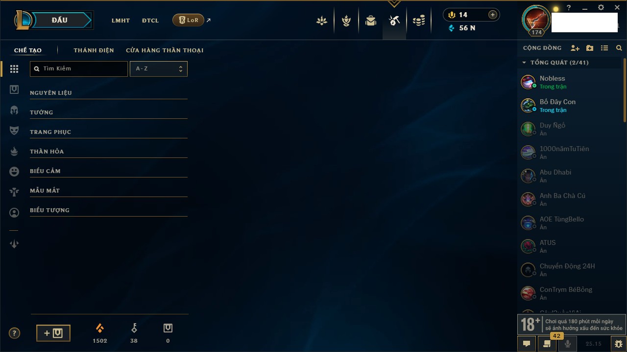 Rank Đơn: Chưa RankKhung: VàngTướng: 171 - Còn 251059 THXTrang Phục: 273Rank ĐTCL: Vàng IIILinh Thú: 171
