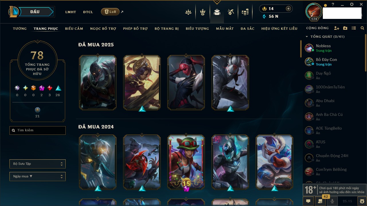 Rank Đơn: Chưa RankKhung: Chưa có khungTướng: 170 - Còn 72514 THXTrang Phục: 202Rank ĐTCL: Chưa RankLinh Thú: 191