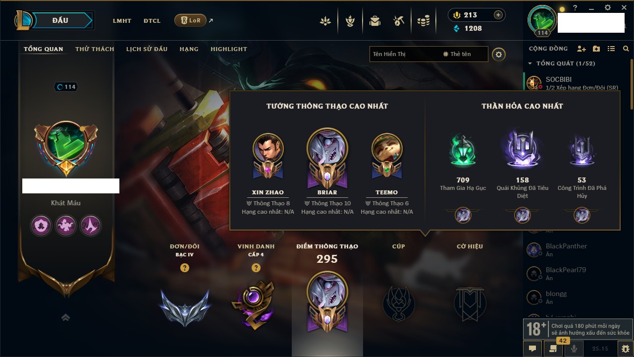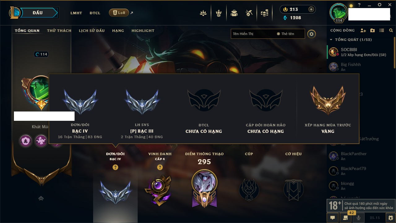 Rank Đơn: Bạch Kim IVKhung: Bạch kimTướng: 172 - Còn 326966 THXTrang Phục: 234Rank ĐTCL: Kim Cương IVLinh Thú: 167