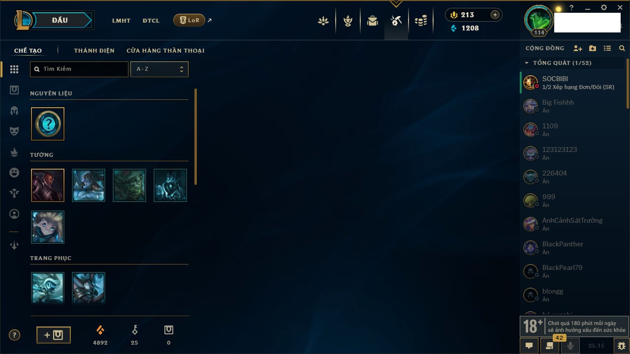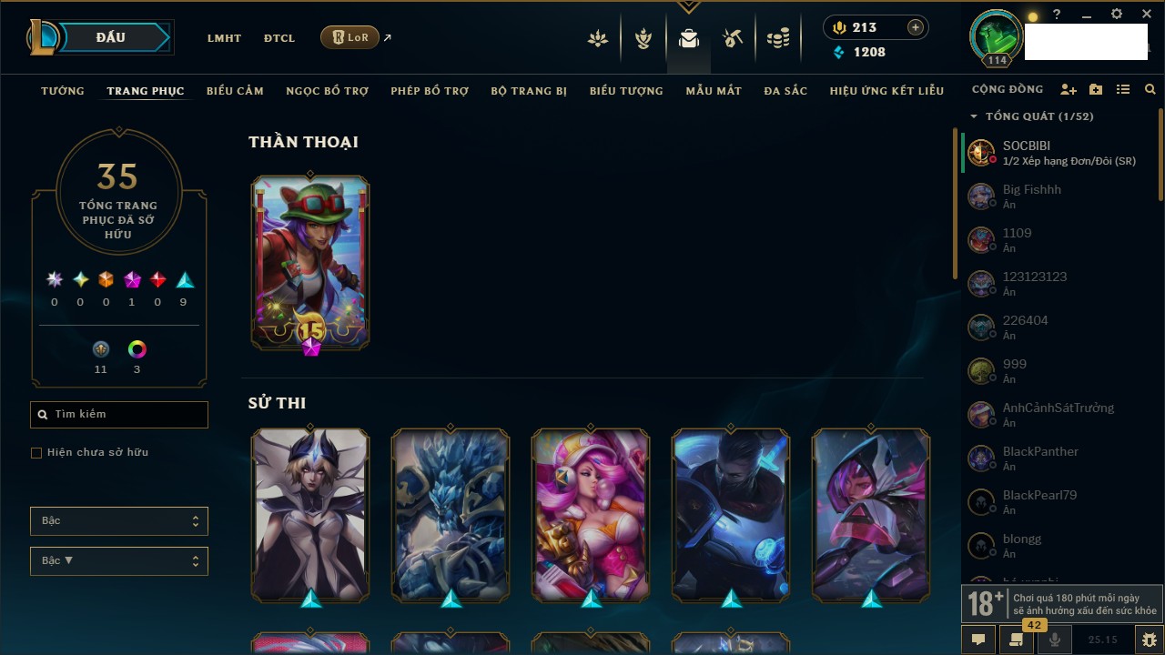 Rank Đơn: Chưa RankKhung: Chưa có khungTướng: 169 - Còn 43188 THXTrang Phục: 205Rank ĐTCL: Chưa RankLinh Thú: 259