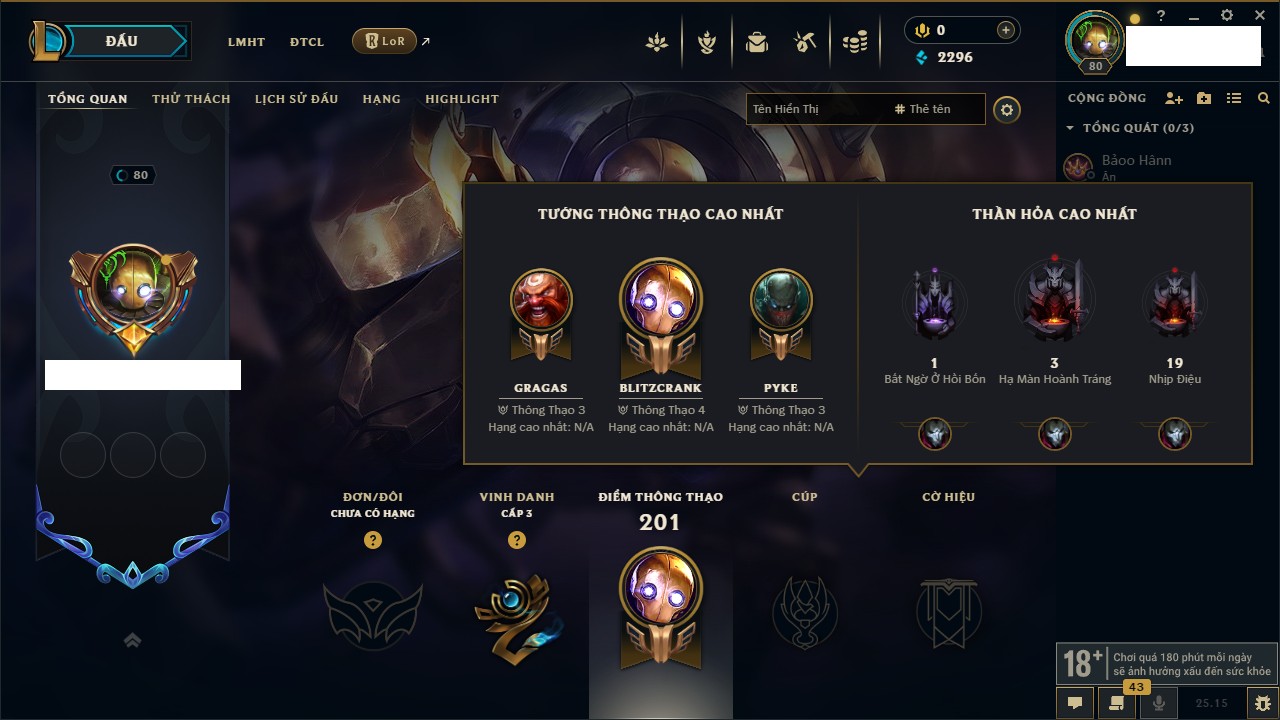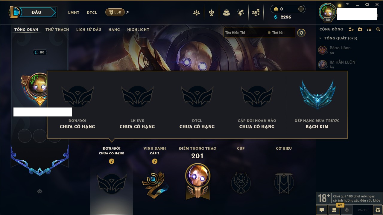Rank Đơn: Chưa rank mùa nào Khung: Chưa có khung Tướng: 3 - Còn 9500 THX Trang Phục: 0 Rank ĐTCL: Bạch Kim IV Linh Thú: 21