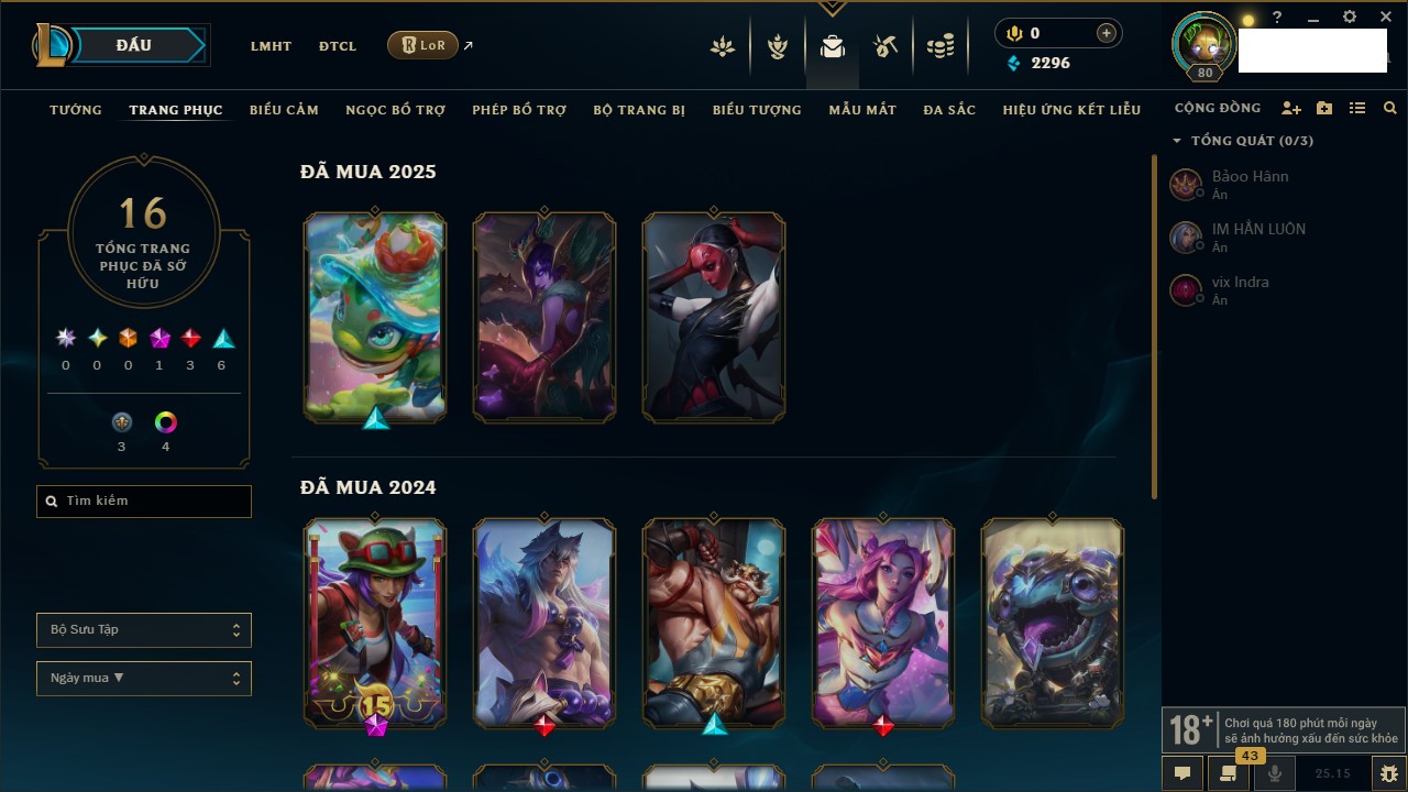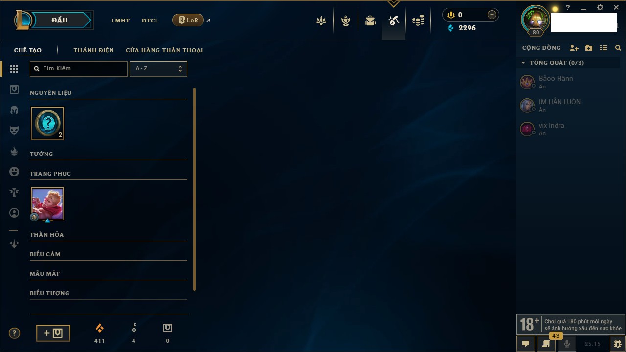 Rank Đơn: Chưa rank mùa nào Khung: Chưa có khung Tướng: 35 - Còn 21851 THX Trang Phục: 3 Rank ĐTCL: Bạch Kim IV Linh Thú: 144