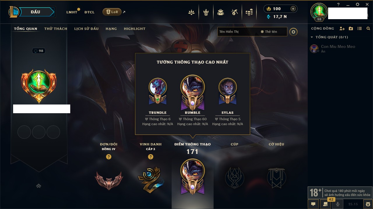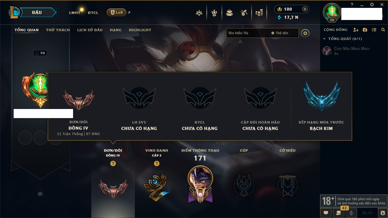Rank Đơn: Bạc IVKhung: BạcTướng: 171 - Còn 263852 THXTrang Phục: 384Rank ĐTCL: Bạch Kim IIILinh Thú: 125