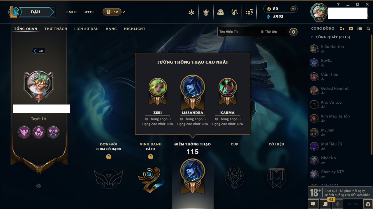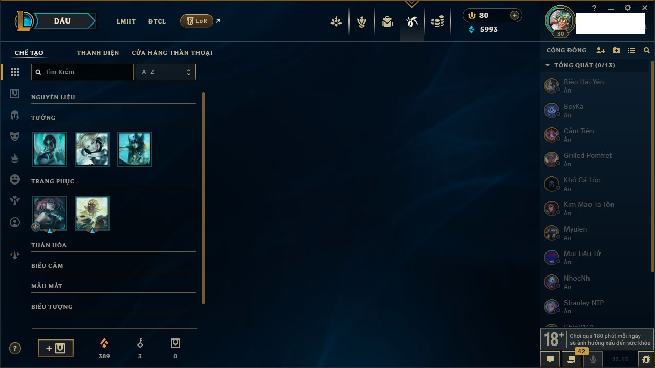 Rank Đơn: Bạch Kim IIKhung: Bạch kimTướng: 171 - Còn 263986 THXTrang Phục: 306Rank ĐTCL: Lục Bảo IVLinh Thú: 96