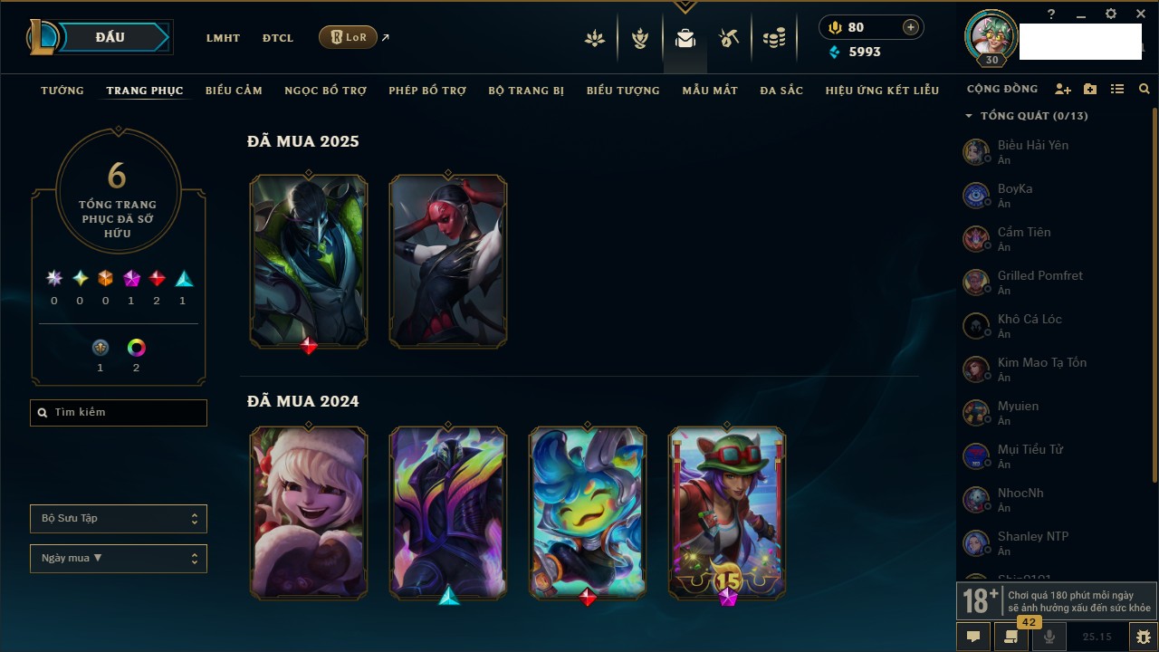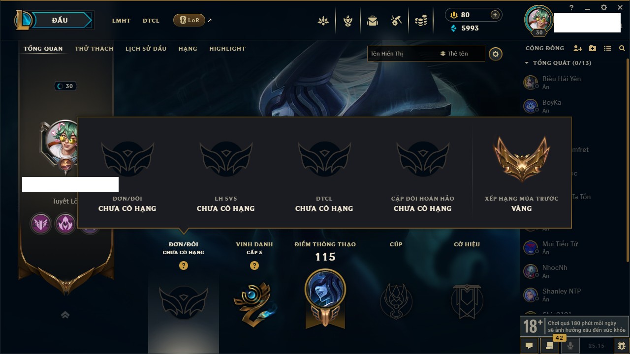 Rank Đơn: Vàng IKhung: Bạch kimTướng: 170 - Còn 212450 THXTrang Phục: 214Rank ĐTCL: Bạch Kim IVLinh Thú: 221