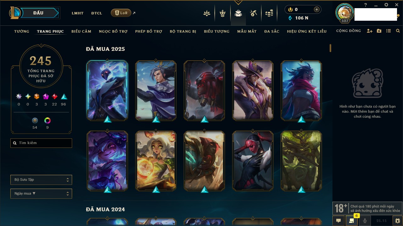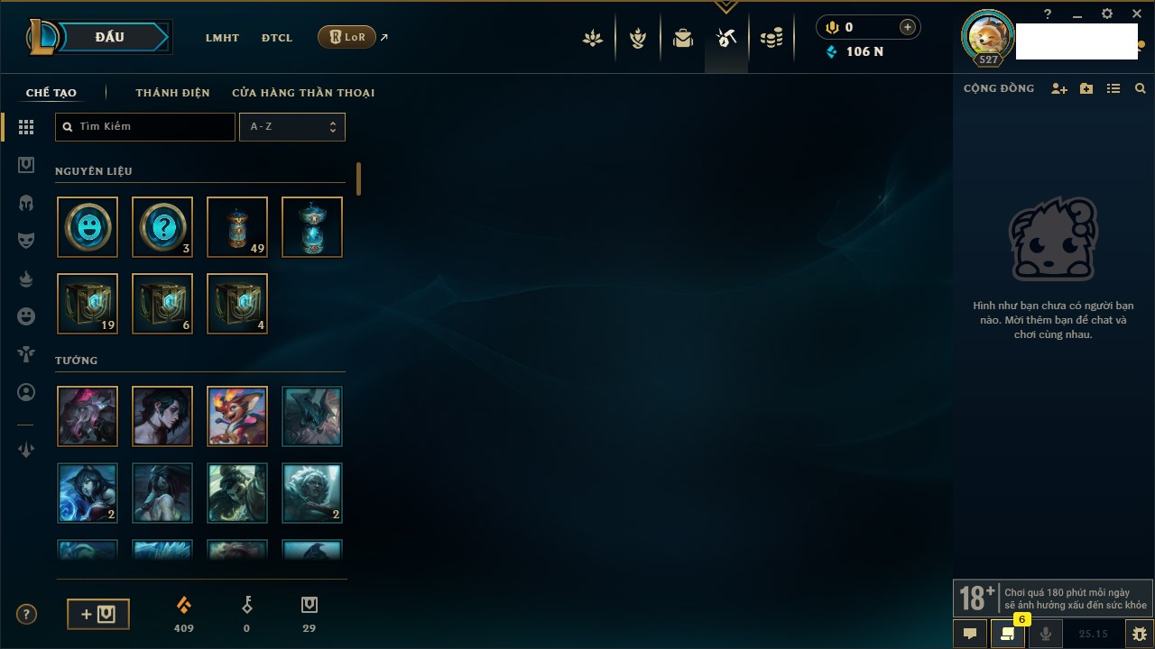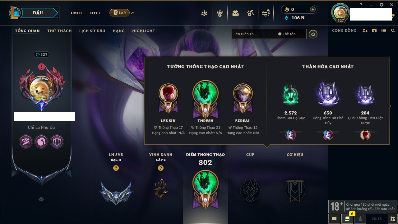 Rank Đơn: Vàng IIIKhung: VàngTướng: 172 - Còn 200315 THXTrang Phục: 87Rank ĐTCL: Chưa RankLinh Thú: 136