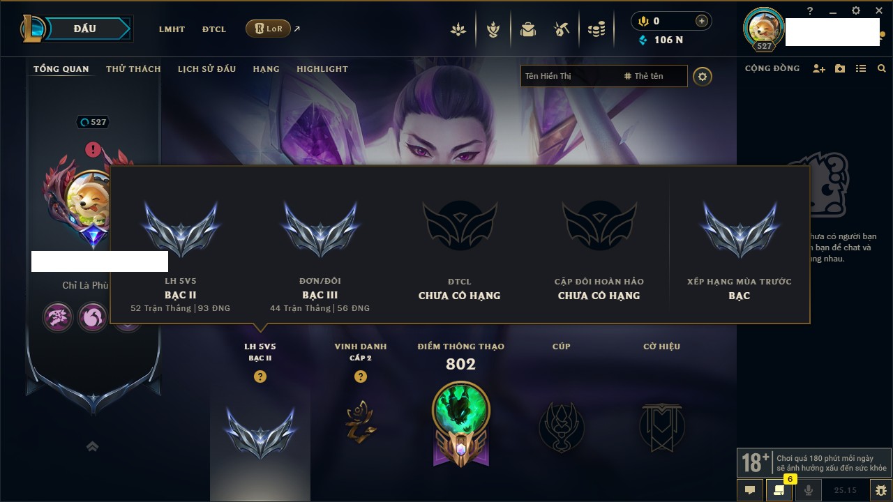 Rank Đơn: Vàng IIKhung: Bạch kimTướng: 172 - Còn 123420 THXTrang Phục: 231Rank ĐTCL: Bạch Kim IVLinh Thú: 213