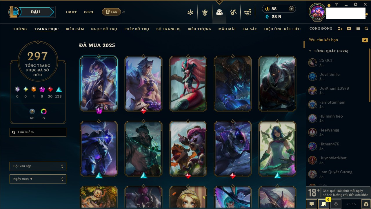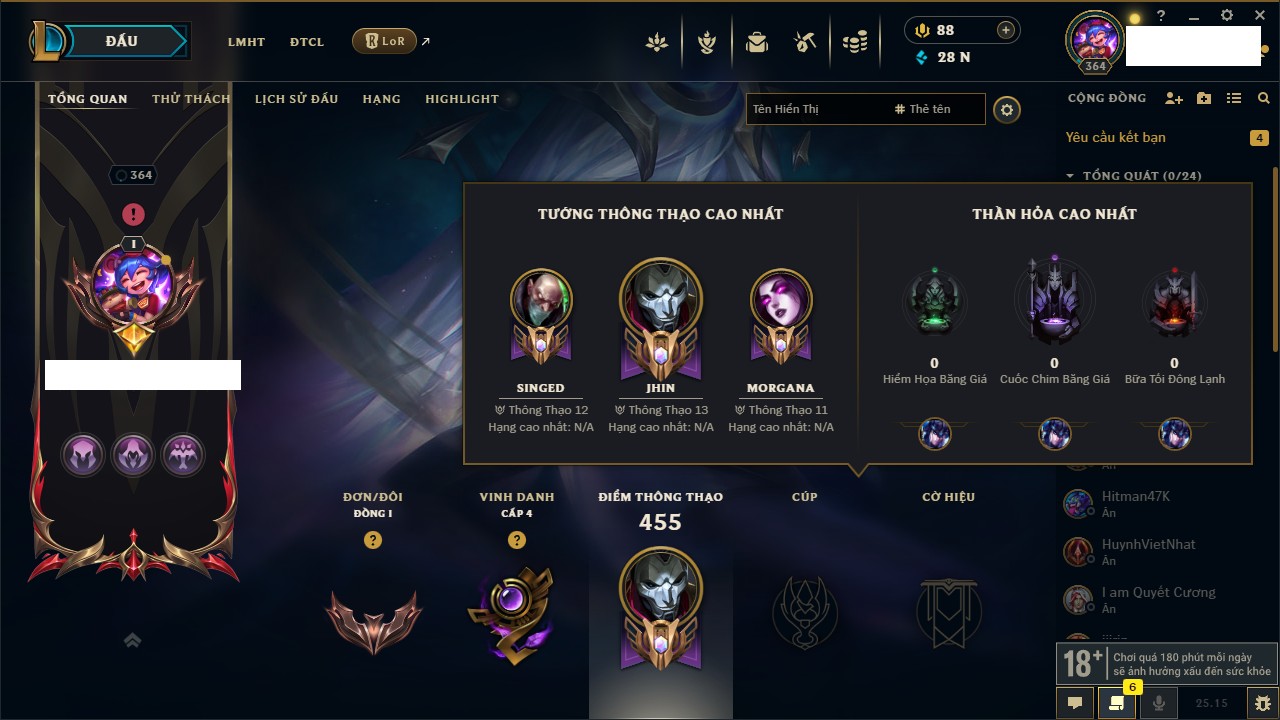 Rank Đơn: Bạch Kim IIKhung: Bạch kimTướng: 171 - Còn 263986 THXTrang Phục: 306Rank ĐTCL: Lục Bảo IVLinh Thú: 96