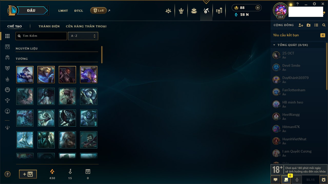 Rank Đơn: Bạch Kim IVKhung: Bạch kimTướng: 171 - Còn 182788 THXTrang Phục: 158Rank ĐTCL: Lục Bảo IVLinh Thú: 56