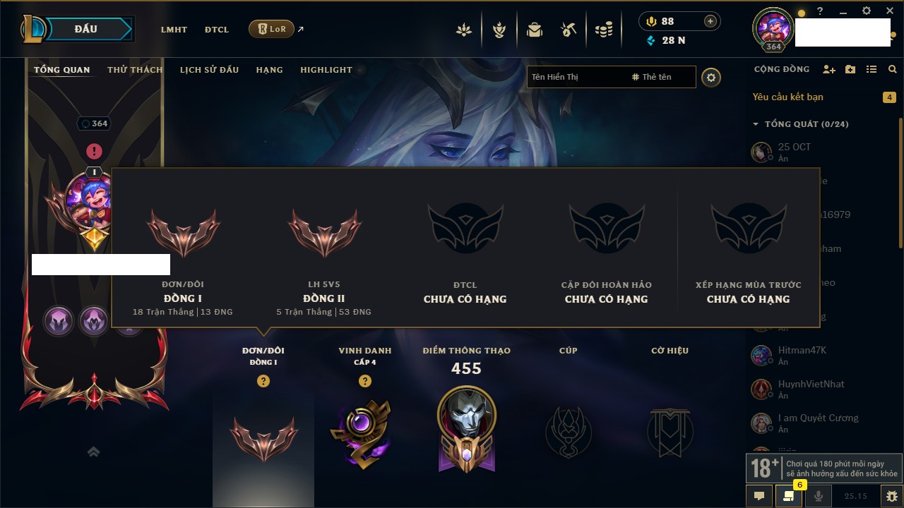 Rank Đơn: Đồng IIIKhung: ĐồngTướng: 170 - Còn 48082 THXTrang Phục: 272Rank ĐTCL: Chưa RankLinh Thú: 84