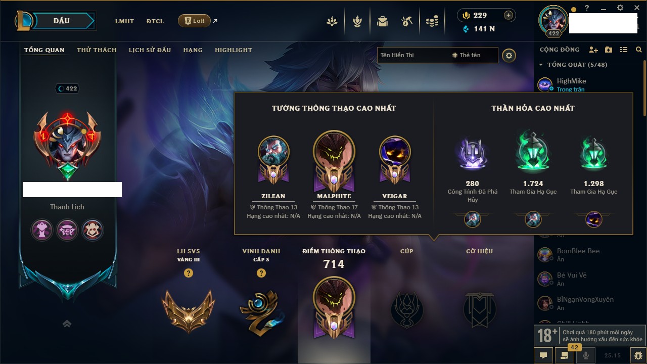 Rank Đơn: Chưa RankKhung: Chưa có khungTướng: 160 - Còn 21398 THXTrang Phục: 380Rank ĐTCL: Chưa RankLinh Thú: 27