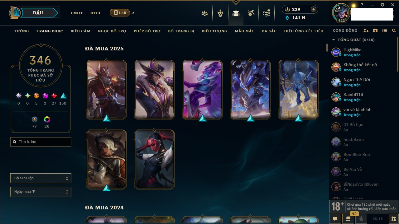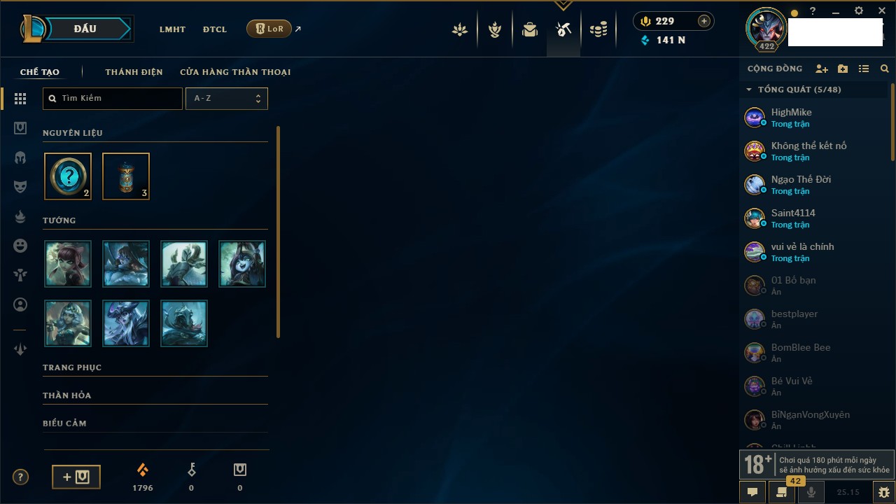 Rank Đơn: Chưa RankKhung: Chưa có khungTướng: 171 - Còn 75227 THXTrang Phục: 425Rank ĐTCL: Chưa RankLinh Thú: 201