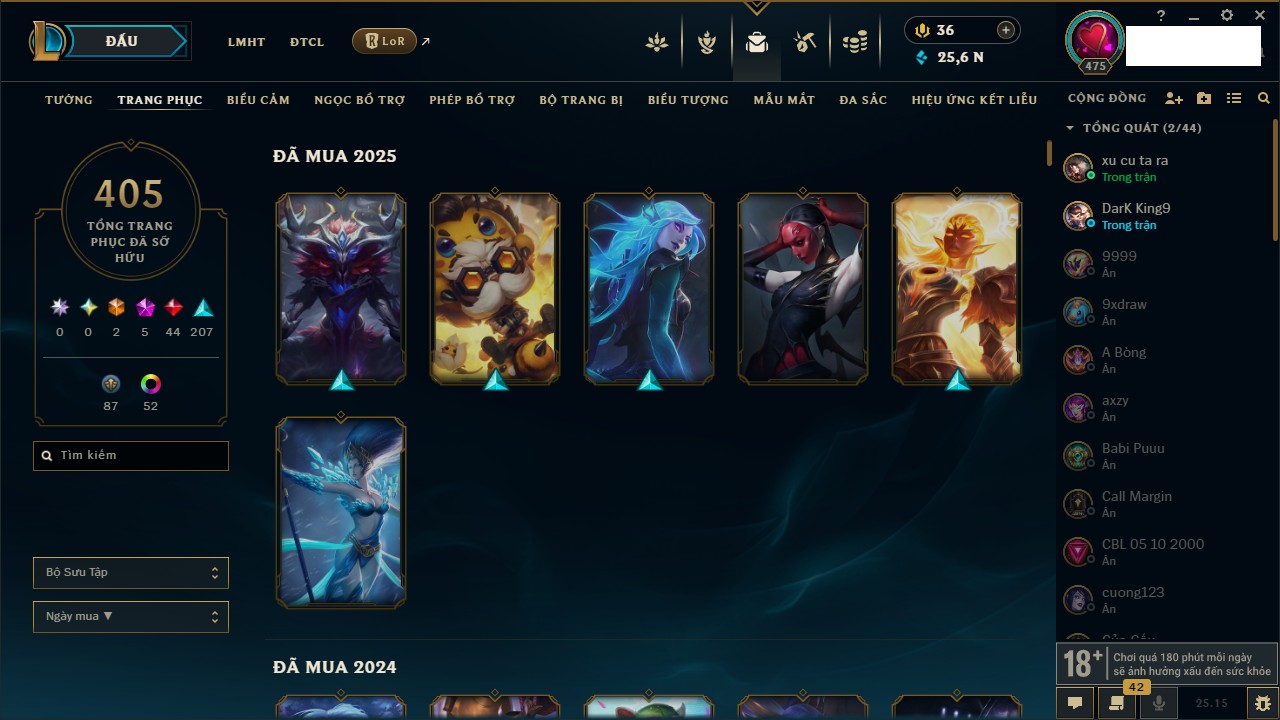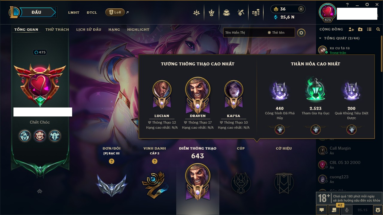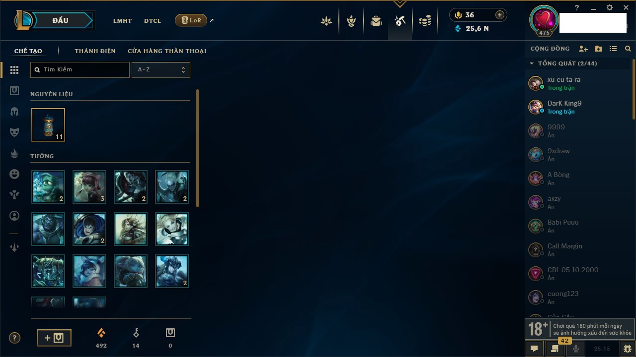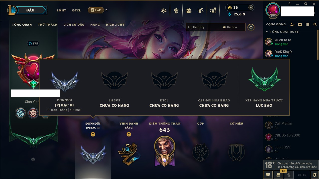 Rank Đơn: Bạc IIKhung: Bạch kimTướng: 169 - Còn 81813 THXTrang Phục: 301Rank ĐTCL: Chưa RankLinh Thú: 140