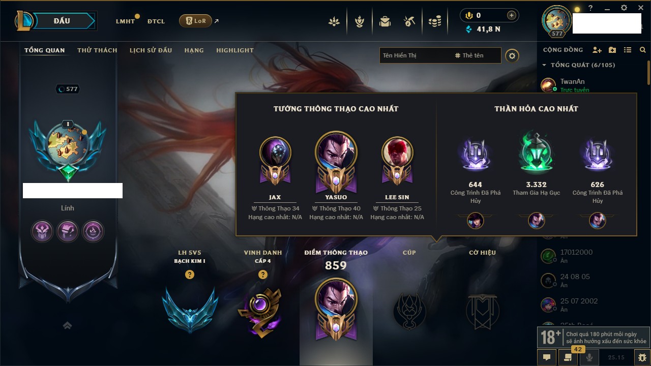 Rank Đơn: Bạch Kim IVKhung: Bạch kimTướng: 171 - Còn 182788 THXTrang Phục: 158Rank ĐTCL: Lục Bảo IVLinh Thú: 56