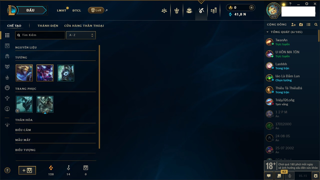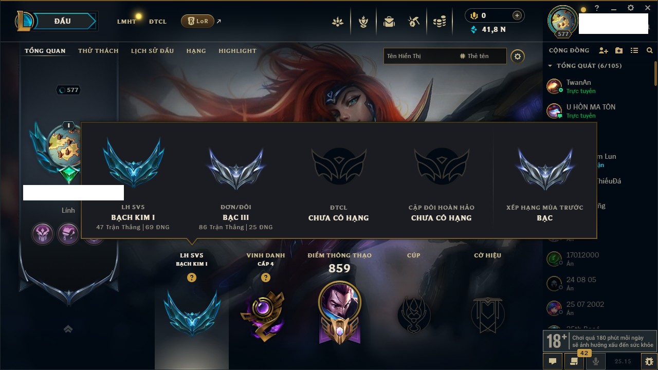 Rank Đơn: Vàng IKhung: Bạch kimTướng: 170 - Còn 212450 THXTrang Phục: 214Rank ĐTCL: Bạch Kim IVLinh Thú: 221