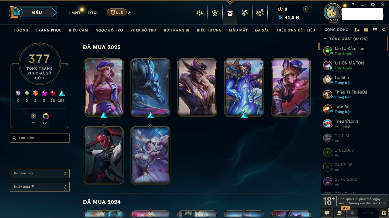 Rank Đơn: Vàng IVKhung: VàngTướng: 171 - Còn 175357 THXTrang Phục: 348Rank ĐTCL: Chưa RankLinh Thú: 46
