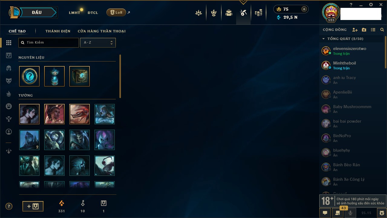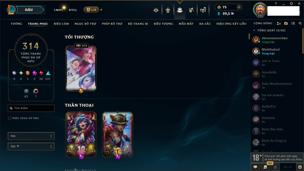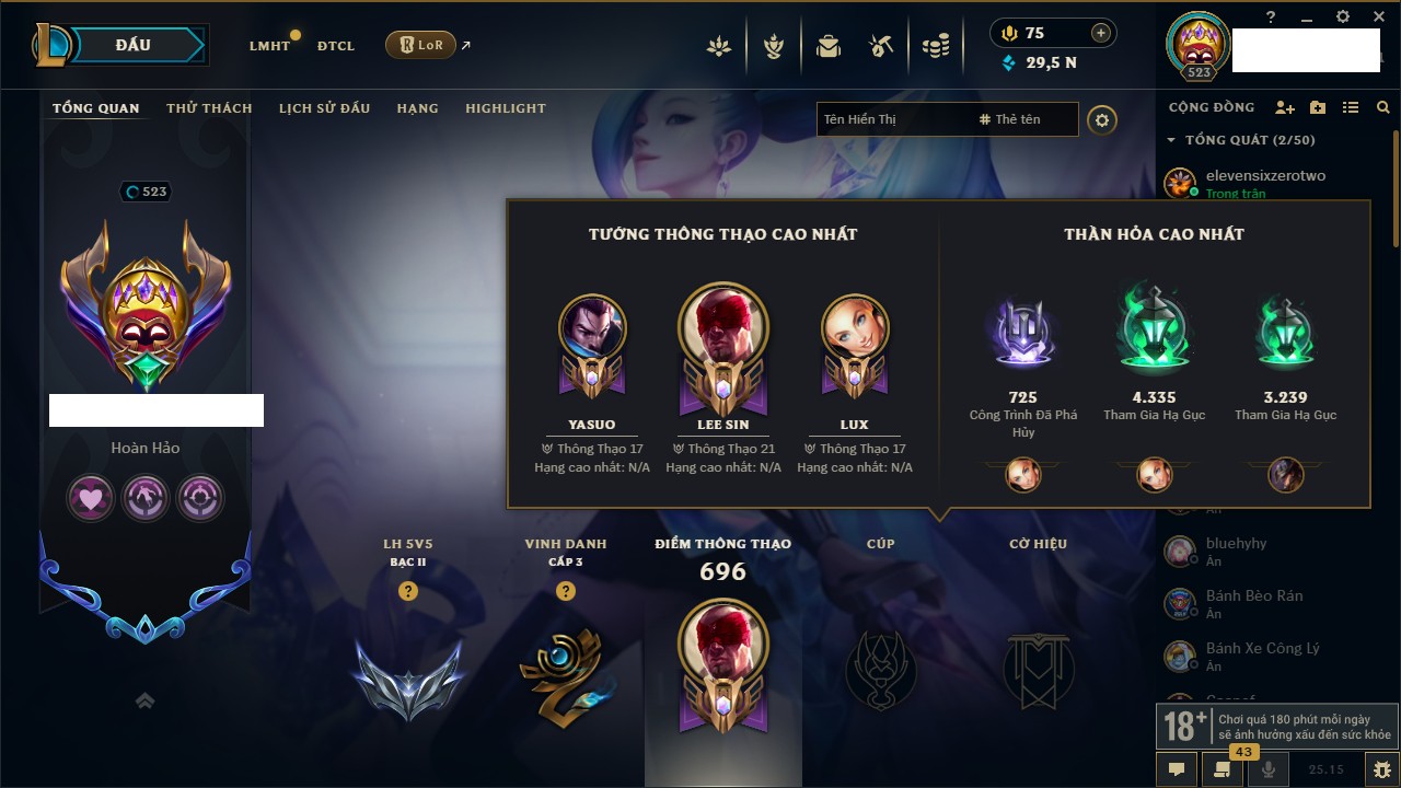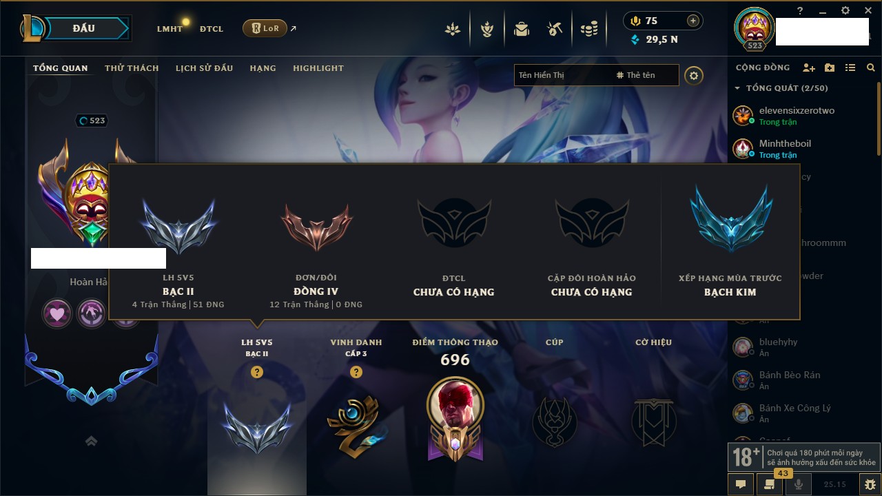 Rank Đơn: Bạc IIKhung: Bạch kimTướng: 169 - Còn 81813 THXTrang Phục: 301Rank ĐTCL: Chưa RankLinh Thú: 140