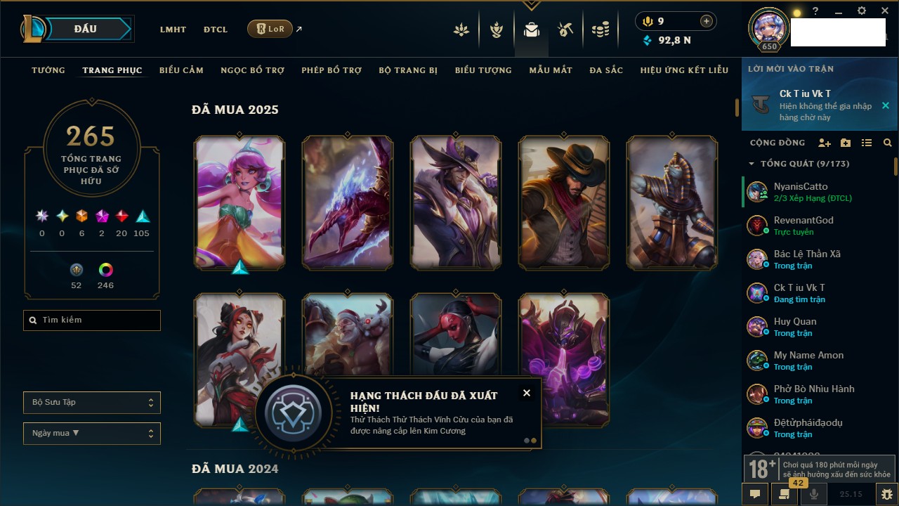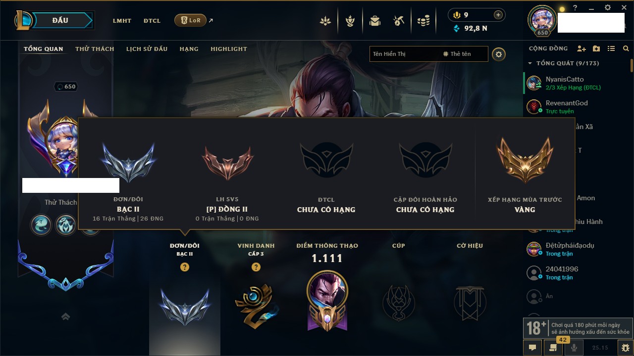 Rank Đơn: Bạch Kim IV Khung: Bạch kim Tướng: 170 - Còn 95523 THX Trang Phục: 243 Rank ĐTCL: Chưa Rank Linh Thú: 150