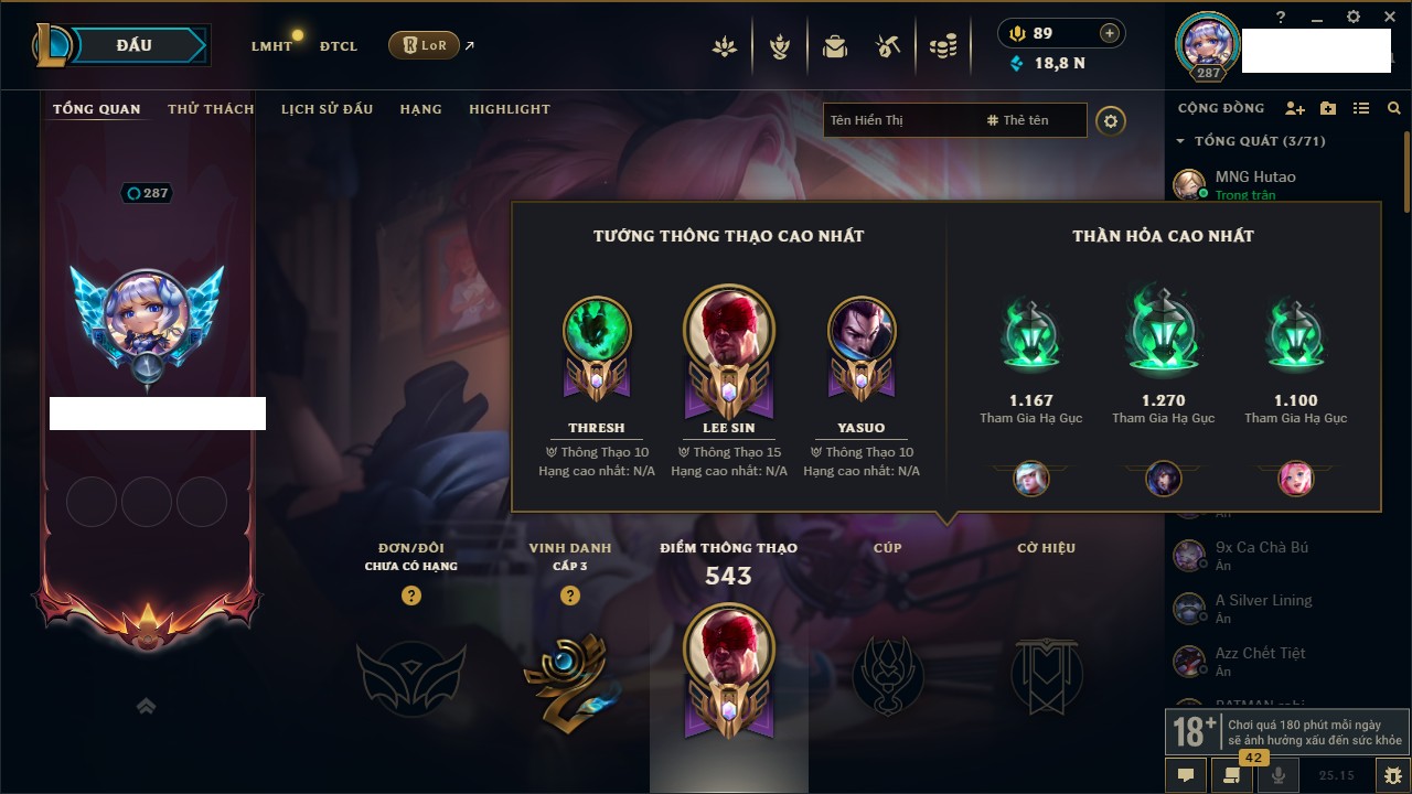 Rank Đơn: Bạch Kim IV Khung: Bạch kim Tướng: 170 - Còn 95523 THX Trang Phục: 243 Rank ĐTCL: Chưa Rank Linh Thú: 150