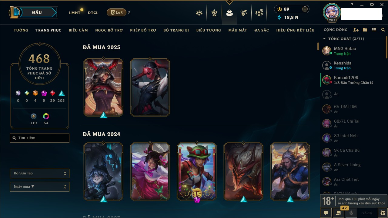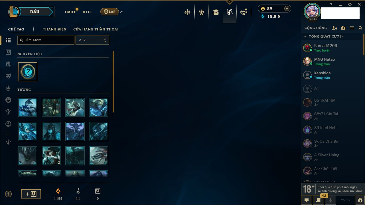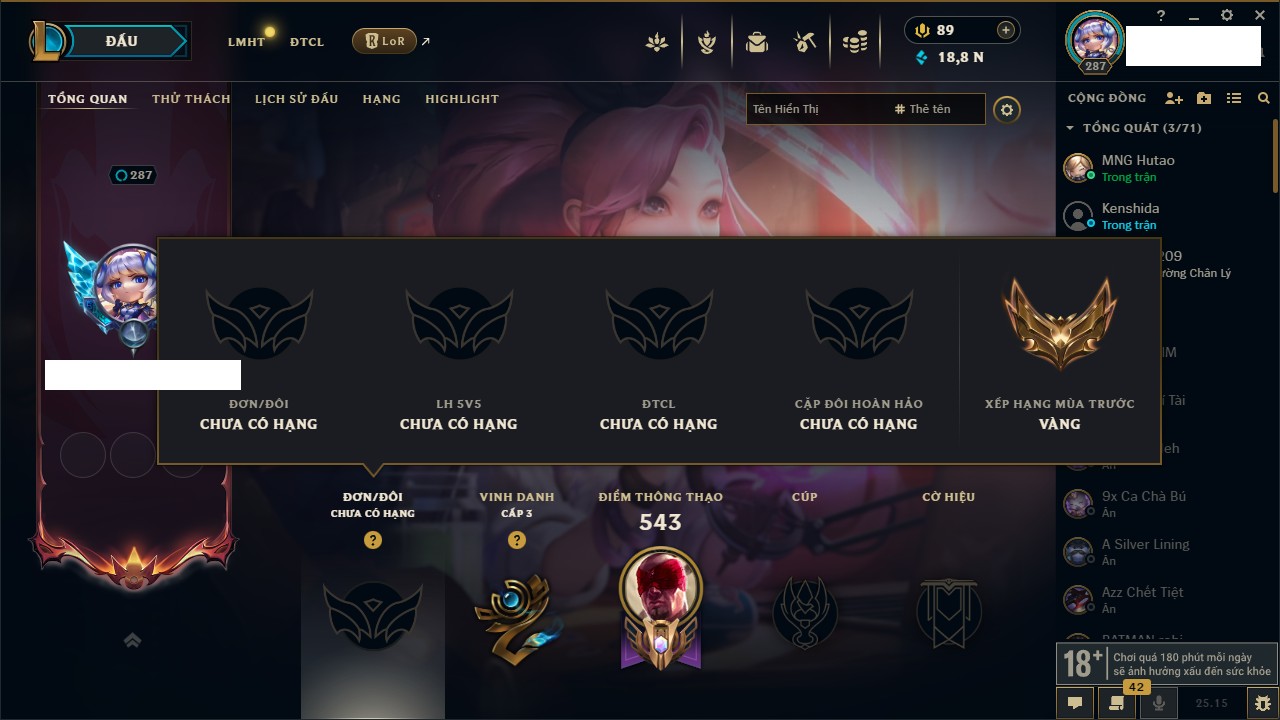 Rank Đơn: Chưa rank mùa nào Khung: Chưa có khung Tướng: 0 - Còn 3000 THX Trang Phục: 0 Rank ĐTCL: Đồng III Linh Thú: 38