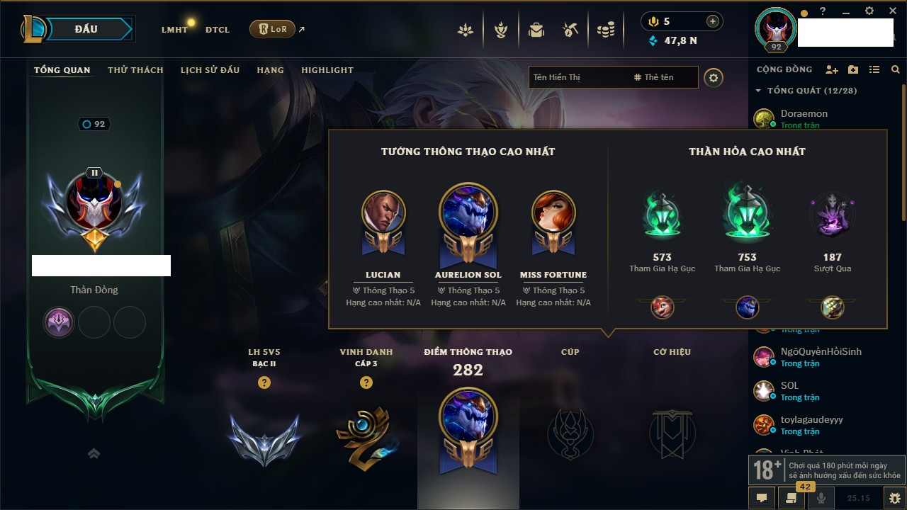 Rank Đơn: Đồng IIIKhung: ĐồngTướng: 170 - Còn 48082 THXTrang Phục: 272Rank ĐTCL: Chưa RankLinh Thú: 84